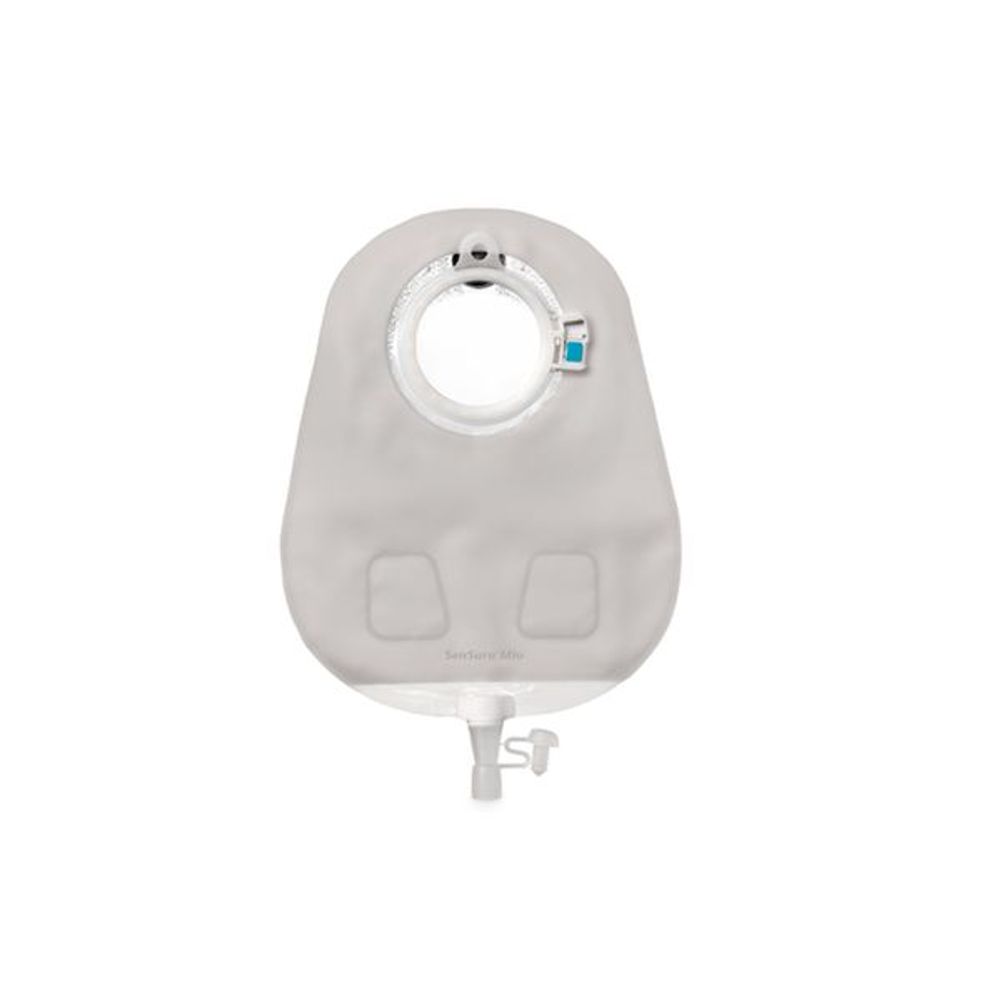 SenSura® Mio Bolsa coletora para urostomia sistema de 2 peças confortável de aparência discreta e natural com sistema de acople audível por um click com botão de travamento sinalizado na cor turqueza e aro de ajuste que permite o reposicionamento da bolsa no abdômen em formato ondulado, conferindo maior flexibilidade e segurança. Apresenta válvula de drenagem, sistema multicâmaras e antirrefluxo. Base adesiva vendida separadamente.