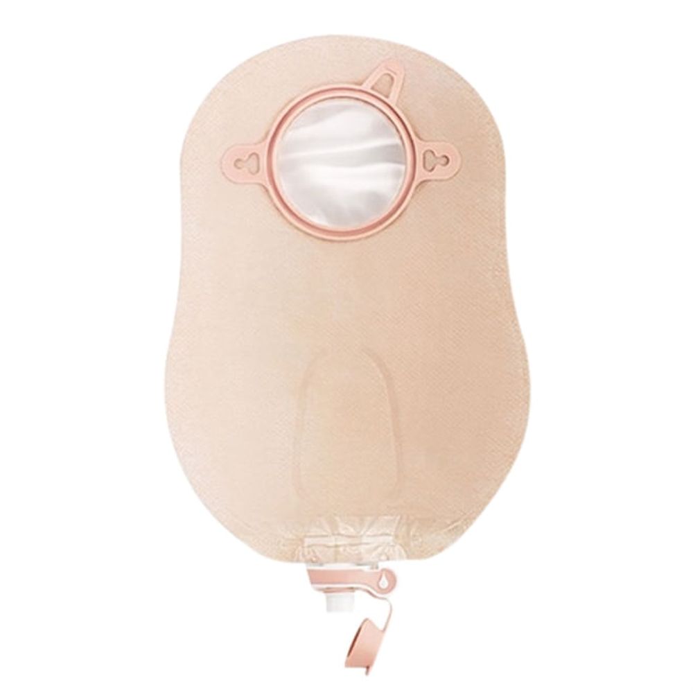 Bolsa de urostomia que possui uma torneira na parte inferior. permitindo a conexão com um coletor de perna ou de cama por meio do adaptador fornecido em cada caixa de bolsa.