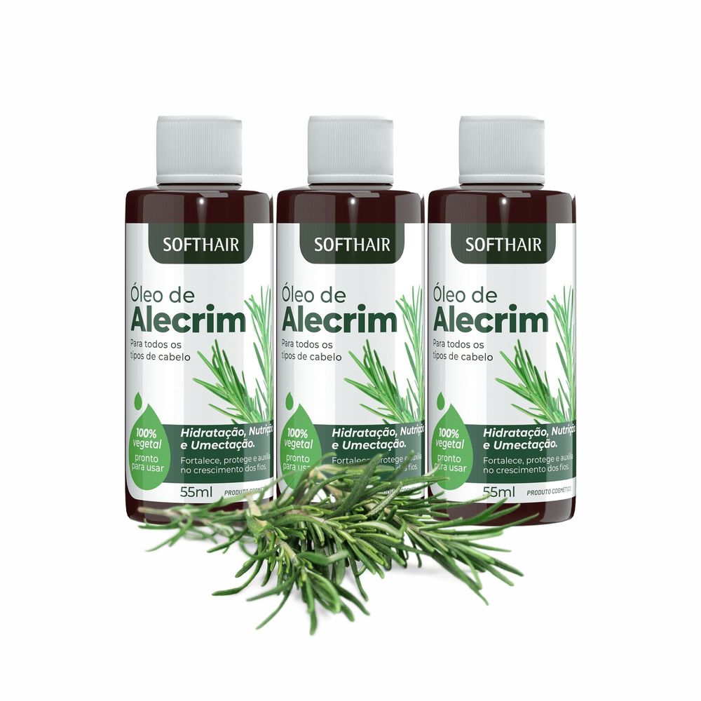 Óleos Soft Hair com Alecrim 55ml – Nutrição e Crescimento Capilar NaturalTransforme seus cabelos com o Óleo de Alecrim Soft Hair, um tratamento capilar completo que combina hidratação, nutrição e umectação profunda em um só produto. Com fórmula 100% vegetal e pronta para uso, é ideal para quem busca resultados visíveis desde as primeiras aplicações.Destaques do produto:Infusão de Óleo Essencial de Alecrim: estimula o crescimento saudável dos fios, melhora a circulação no couro cabeludo e combate a queda capilar.Hidratação e nutrição intensas: combate o ressecamento e restaura a maciez dos fios.Brilho e vitalidade natural: realça o aspecto saudável dos cabelos, com toque sedoso e luminoso.Fácil de aplicar: produto pronto para uso, ideal para todos os tipos de cabelo.Benefícios:Fortalece e protege os fios da raiz às pontasEstimula o crescimento capilar com ação revitalizanteIndicado para cronograma capilar: hidratação, nutrição e umectaçãoExperimente o poder do óleo de alecrim para cabelo em uma fórmula inovadora e eficaz. Sinta seus fios mais fortes, saudáveis e cheios de vida com a Carga de Óleos Soft Hair!ANVISAPROCESSO: 25351.174682/2019-55 AFE 2.01236.1MODOS DE USO: 1) Potencialize sua máscara ou creme aplicando até 15 gotas do produto e faça o uso normalmente. - 2) Para umectação: aplique o produto em toda a extensão dos fios e deixe agir por no mínimo 30minutos, podendo ser aplicado durante a noite — neste caso, indicamos o uso de uma touca de cetim —, após o tempo de pausa seguir com a higienização normal dos fios. - 3)Para auxiliar no crescimento: com os cabelos secos aplique de 5 à 15 gotas do produto nos fios e couro cabeludo realizando movimentos circulares para ativar a microcirculação da região, deixe agir de 5 à 10min e higienize os fios normalmente após o tempo de pausa. Utilize a linha Soft Hair de sua preferência!--------------------------------------------------Principais Tags de Pesquisa:oleo de alecrim, oleo essencial de alecrim, óleo essencial de alecrim, oleo essencial alecrim, oleo vegetal de alecrim, oleo de alecrim pro cabelo, oleo de alecrim puro, óleo de alecrim para queda de cabelo, alecrim crescimento capilar, alecrim para crescimento capilar