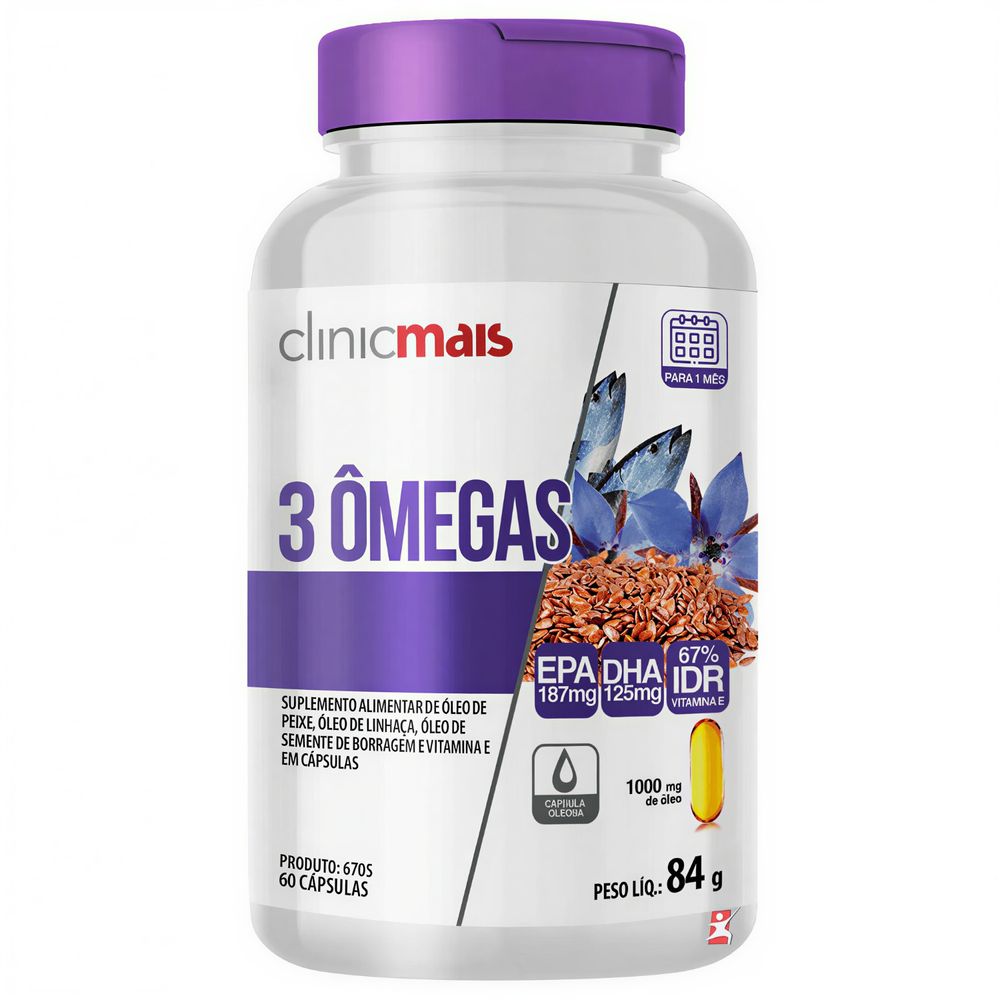 3 ÔMEGAS - ÓLEO DE PEIXE + ÓLEO DE LINHAÇA + ÓLEO DE BORRAGEM 60 CAPSULAS - CLINICMAIS O QUE É O 3 ÔMEGAS?O 3 Ômegas é um suplemento alimentar que combina três fontes de ácidos graxos essenciais: óleo de peixe, óleo de linhaça e óleo de semente de borragem. Muitas pessoas buscam essa combinação para complementar a alimentação com gorduras saudáveis, que podem ser difíceis de obter na dieta do dia a dia. INGREDIENTES DO 3 ÔMEGAS E SUAS FUNÇÕES- Óleo de Peixe:Pessoas que se preocupam com a saúde do coração consomem óleo de peixe porque estudos indicam que o EPA e o DHA podem auxiliar no equilíbrio dos níveis de triglicerídeos.Quem busca suporte para a memória e concentração também recorre ao DHA, um dos principais componentes do cérebro e essencial para as funções cognitivas.Consumidores que reclamam de dores articulares procuram o óleo de peixe porque o EPA é amplamente estudado por sua ação sobre o metabolismo inflamatório, sendo associado ao suporte das articulações. - Óleo de Linhaça:Mulheres que buscam equilíbrio hormonal relatam o uso da linhaça por ser fonte de lignanas, compostos naturais que podem auxiliar no suporte ao ciclo menstrual e menopausa.Pessoas que querem melhorar a digestão consomem óleo de linhaça por ser fonte de fibras e ajudar na regulação intestinal.Quem tem pele ressecada busca o óleo de linhaça porque ele fornece ácidos graxos essenciais que podem ajudar na hidratação da pele de dentro para fora. - Óleo de Semente de Borragem:Mulheres que sofrem com TPM e inchaço utilizam o óleo de borragem por ser rico em GLA, um ácido graxo estudado por sua ação no metabolismo hormonal.Pessoas que reclamam de retenção de líquidos relatam que o óleo de borragem pode auxiliar na saúde da circulação, favorecendo o equilíbrio hídrico do organismo.Quem deseja melhorar a elasticidade da pele também consome óleo de borragem, pois estudos indicam que o GLA pode auxiliar na manutenção da firmeza da pele.Por que a união desses ingredientes é importante? A combinação de ômega-3, ômega-6 e ômega-9 traz um aporte completo de gorduras essenciais, que podem ser benéficas para quem busca suporte para a pele, articulações, equilíbrio hormonal e circulação. Fóruns de nutrição e saúde mostram que muitas pessoas consomem esse mix para complementar a alimentação com nutrientes que podem auxiliar nesses aspectos. O 3 ÔMEGAS POSSUI CONTRAINDICAÇÕES?Este suplemento é indicado para indivíduos com idade igual ou superior a 19 anos. Não deve ser consumido por pessoas alérgicas a peixes ou frutos do mar, nem por gestantes e lactantes sem orientação profissional. O 3 ÔMEGAS É VEGANO?Não. O produto contém óleo de peixe e cápsulas de gelatina, ingredientes de origem animal. QUAL A FORMA CORRETA DE USO DO 3 ÔMEGAS?Quantidade diária recomendada: Ingerir 2 cápsulas ao dia, preferencialmente junto às refeições.Horário ideal de consumo: Pode ser tomado pela manhã ou à noite, de acordo com a preferência do consumidor. CONSCIENTIZAÇÃO SOBRE O USO DO SUPLEMENTOOs ômegas são nutrientes essenciais, ou seja, precisam ser obtidos pela alimentação. O uso contínuo pode ser um diferencial para quem deseja obter os benefícios desses ácidos graxos no longo prazo. DICAS PARA POTENCIALIZAR OS RESULTADOS- Associar a uma alimentação equilibrada, incluindo fontes naturais de gorduras boas, como peixes, abacate e castanhas.- Beber bastante água, pois a hidratação influencia na absorção dos nutrientes lipossolúveis.- Praticar atividade física regularmente, o que auxilia na circulação e no metabolismo das gorduras essenciais. O 3 ÔMEGAS É REGULAMENTADO PELA ANVISA?Sim. Este produto é dispensado de registro conforme a Resolução RDC nº 240/2018 da ANVISA. "ESTE PRODUTO NÃO É UM MEDICAMENTO. NÃO EXCEDER A RECOMENDAÇÃO DIÁRIA DE CONSUMO INDICADA NA EMBALAGEM. MANTENHA FORA DO ALCANCE DE CRIANÇAS."