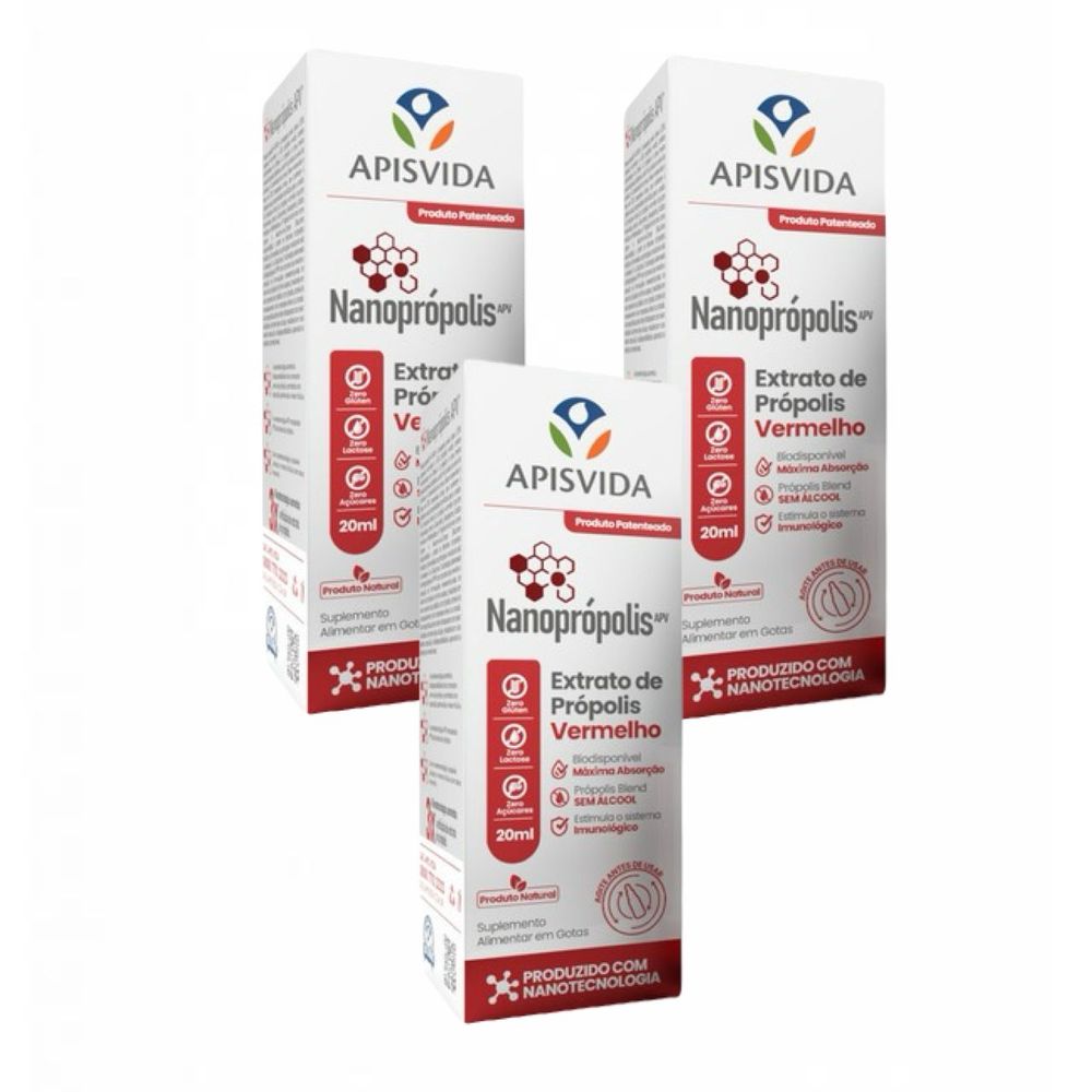NANOPRÓPOLIS - EXTRATO DE PRÓPOLIS VERMELHO. Kit contendo 3 frascos com 20 ml cada.O Nanoprópolis é um suplemento inovador que combina o poder da própolis vermelha e verde, as mais raras e benéficas da natureza, em uma fórmula nanoestruturada para máxima absorção. A tecnologia nanoestruturada do Nanoprópolis encapsula os compostos ativos da própolis em nanopartículas, que são absorvidas até 3 vezes mais rápido. Diferenciais Inovadores: 1. Biodisponibilidade Superior: Absorção máxima dos nutrientes para resultados mais eficazes; 2. Liberação Prolongada: Efeito duradouro ao longo do dia; 3. Maior Efeito Biológico: Ação mais potente; 4. Maior Estabilidade dos Ativos: Fórmula preservada por mais tempo.Sem Álcool, Glúten, Lactose e Açúcar. Ideal para todos.Sugestão de uso do Fabricante: Consumir 15 gotas por dia, diluídas em até 100ml de água ou suco. Pode ser aplicado diretamente na pele. Contraindicações: Pessoas alérgicas à própolis. Gestantes e crianças menores de 2 anos devem consultar médico ou nutricionista antes de usar. Atenção: Este produto não é um medicamento. Não exceder a recomendação diária do fabricante do produto. Sempre consumir com supervisão médica.Isento de Registro no MS/ANVISA de Acordo com RDC N°240/2018.