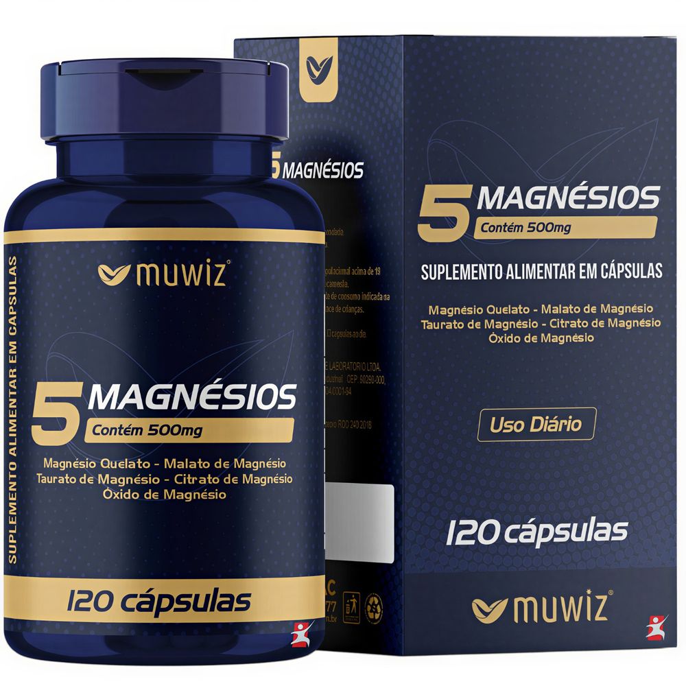 DESCRIÇÃO5 Magnésios da Muwiz, como o próprio nome já diz, é composto por 5 tipos de magnésios. Auxilia na formação de ossos e dentes, no metabolismo energético e no metabolismo de proteínas, carboidratos e gorduras. RECOMENDAÇÃO DE USOIngerir 2 cápsulas ao dia. TABELA NUTRICIONALAnexo nas imagens do anúncio. COMPOSIÇÃOÓxido de magnésio,sulfato de magnésio monohidratado,taurato de magnésio,bisglicinato de magnésio,malato de magnésio eantiumectante dióxido de silício.Composição cápsula: gelatina. NÃO CONTÉM GLÚTEN. CUIDADOS DE CONSERVAÇÃO & RECOMENDAÇÕES & CUIDADOSConservar ao abrigo da luz, calor e umidade.Após aberto consumir em até 60 dias.Produto indicado para o grupo populacional acima de 19 anos.Este produto não é um medicamento.Não exceder a recomendação diária de consumo indicada na embalagem. Mantenha fora do alcance de crianças. REGISTRO ANVISAProduto dispensado de registro conforme RDC 240/2018.