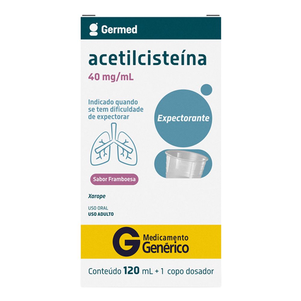A Acetilcisteína Xarope 40mg/ml Genérico Germed é indicada para auxiliar na expectoração em afecções do trato respiratório. O medicamento ajuda na expectoração de muco denso e viscoso, que costumam ocorrer em bronquites crônicas, pneumonia e fechamento dos brônquios. A embalagem contém 120ml.