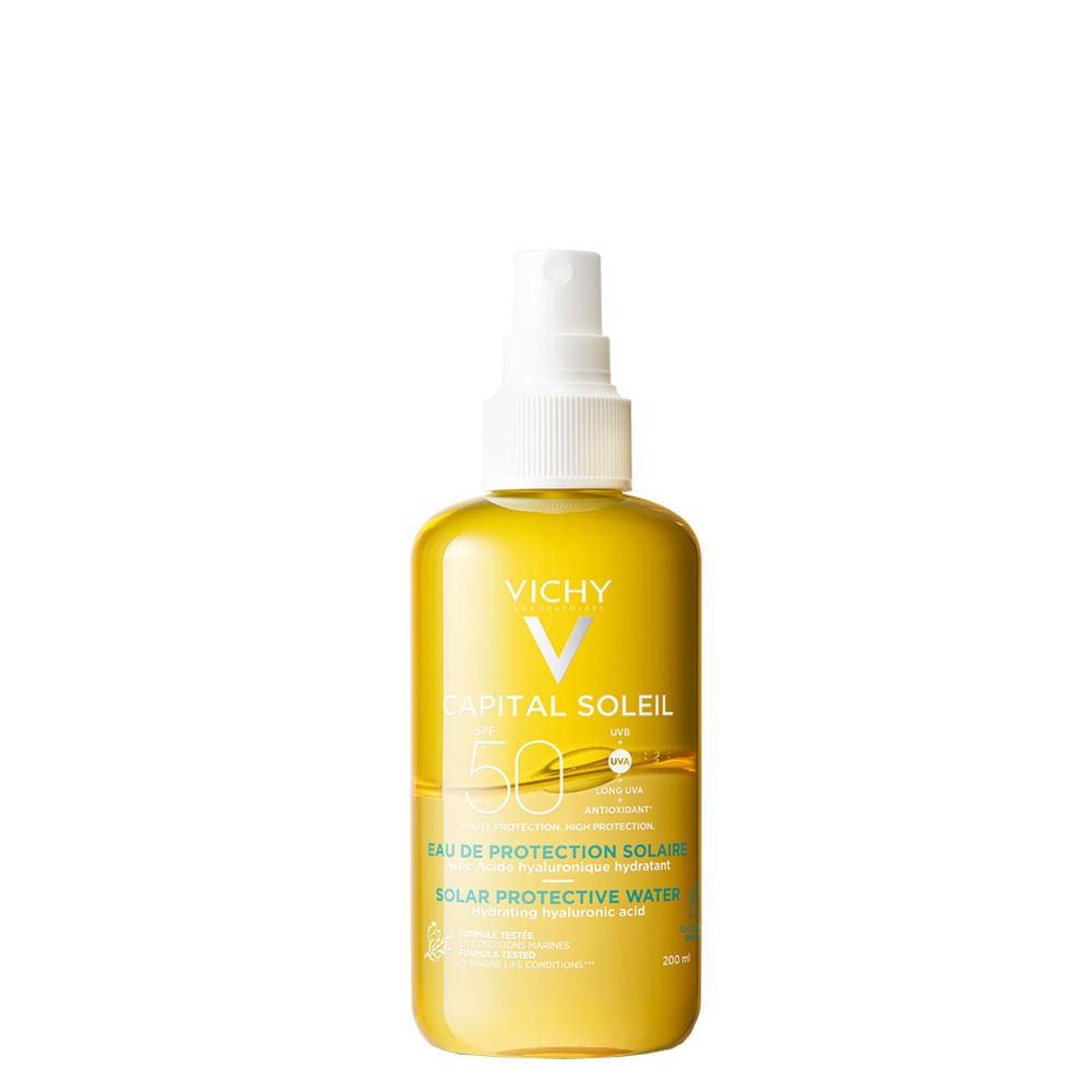 - A Água Solar FPS50 protege e hidrata com sua textura aquosa bifásica, leve como água e de rápida absorção.