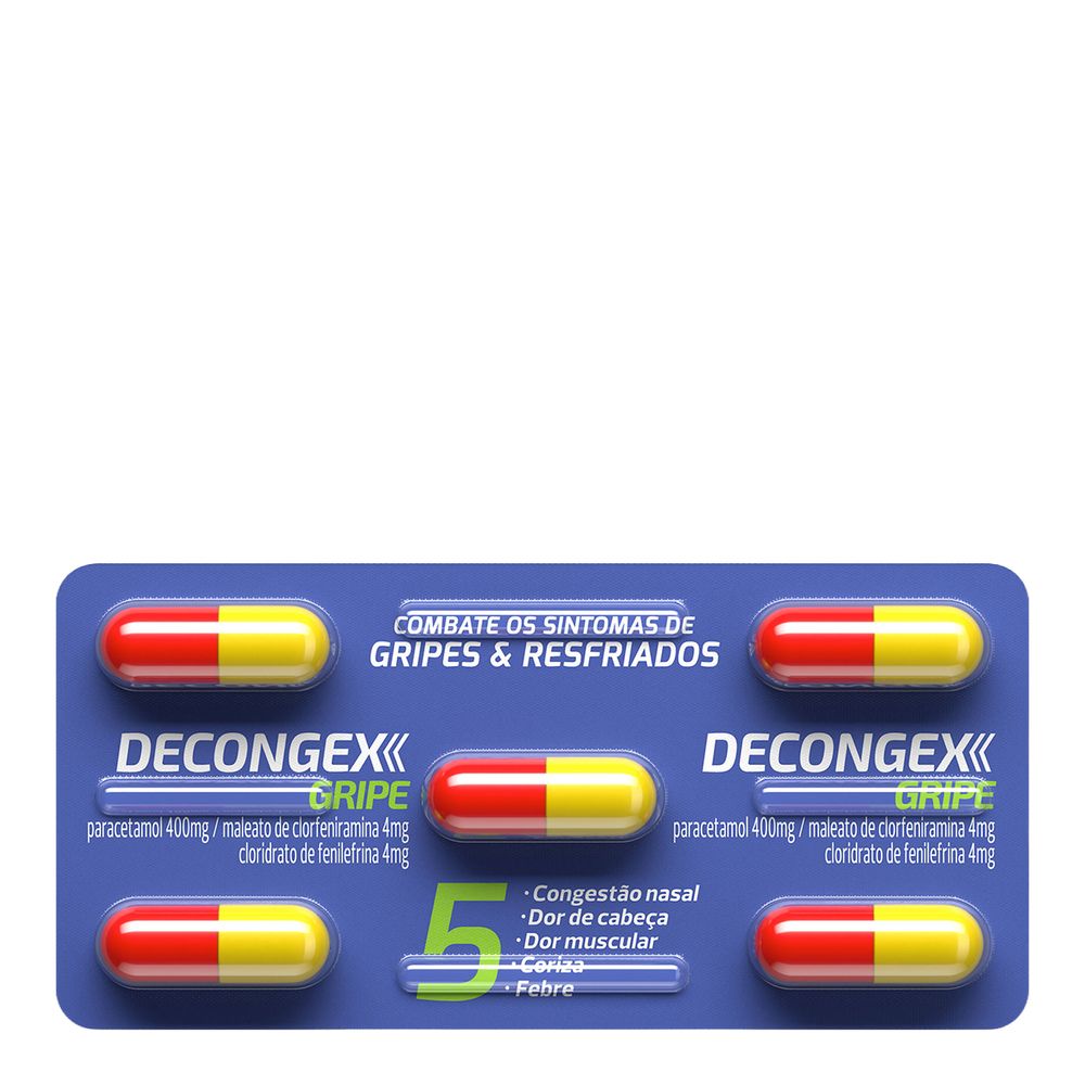 Decongex Gripe é um medicamento antigripal produzido pela Aché Laboratórios, apresentado em embalagem contendo 5 comprimidos. Sua fórmula contém a associação de três princípios ativos que atuam no controle e alívio dos sintomas associados a gripes e resfriados.