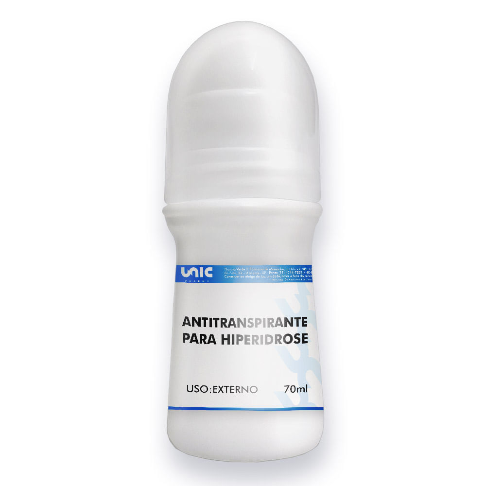 Antitranspirante para HiperidroseDesconforto nunca mais!O Antitranspirante possui em sua formulação o ativo cloreto de alumínio que age formando uma pelicula protetora que cobre as glândulas sudoríparas afetadas, inibindo o suor excessivo e o mau cheiro ocasionado pelo excesso de suor. O excesso de suor é reabsorvido pelo corpo e eliminado de forma natural diminuindo os constrangimento do dia a dia. Os resultados aparecem após algumas semanas de uso, a excessiva transpiração desaparece e o efeito do produto permanece durante dias.BenefíciosControle do suor excessivo (Indicação Principal);Controle do mau cheiro.PosologiaPrimeiramente deve-se secar a área antes de cada aplicação.Em seguida, aplicar nas áreas (axilas, região lombar, pernas, virilhas, mãos e pés) antes de deitar, pois a noite as glândulas sudoríparas estão menos ativadas.Pela manhã lavar as áreas com água e sabão.OBS: No inicio do tratamento o produto deve ser utilizado todas as noites. Depois de 3 semanas as aplicações devem ocorrer de 2 a 3 vezes por semana.Composição sugeridaPorção: 70mlQuantidade por porção:Alumínio Cloridroxido 25%Irgasan 0,2%Óleo de Silicone 1%Loção não iônica q.s.p 70mlSugestão de uso e benefícios desenvolvidos por profissional habilitado. Todo produto deste site possui dosagens dentro dos padrões usuais.O que é hiperidrose?A Hiperidrose é uma condição caracterizada por suor excessivo além do necessário para regular a temperatura do corpo.Como tratar a hiperidrose?Embora não haja cura para hiperidrose, usar o Antitraspirante para Hiperidrose da Unicpharma, pode minimizar os efeito do suor excessivo.Como usar o antitraspirante para hiperidrose?Primeiramente deve-se secar a área antes de cada aplicação.Em seguida, aplicar nas áreas (axilas, região lombar, pernas, virilhas, mãos e pés) antes de deitar, pois a noite as glândulas sudoríparas estão menos ativadasPela manhã lavar as áreas com água e sabão.OBS.: No inicio do tratamento o produto deve ser utilizado todas as noites. Depois de 3 semanas as aplicações devem ocorrer de 2 a 3 vezes por semana.Onde comprar antitraspirante para hiperidrose ? Os melhores desodorantes para hiperidrose são os manipulados (receitados por dermatologistas). Só na Unicpharma você encontra o antitranspirante hiperidrose, com os melhores preços e as melhores condições. Esse antitraspirante pode ser utilizado também para quem sofre com sudorese?Sim, pois ela ajuda no controle do suor excessivo.*Não se trata de propaganda, e sim de descrição do produto, consulte sempre um especialista. **Venda Sob prescrição de profissional habilitado, podendo este ser o nosso farmacêutico de acordo com a resolução 586/2013 do conselho de farmácia. Consulte-o. Sugestão de uso e benefícios desenvolvidos por profissional habilitado. Todo produto deste site possui dosagens dentro dos padrões usuais.Advertências* Estiver Grávida Ou Amamentando, Consulte Um Médico Antes De Usar Este Produto.* Mantenha Fora Do Alcance De Crianças. Guarde Em local frio e seco. * Não misturar esse medicamento com outro tipo de estimulante drogas ou bebida alcoólica.1. Nunca compre medicamento sem orientação de um profissional habilitado.2. Imagens meramente ilustrativas.s3. É recomendável uma dieta e exercícios físicos para auxiliar a redução de "peso".4. Pessoas com hipersensibilidade à substância não devem ingerir o produto. 5. Em caso de hipersensibilidade ao produto recomenda- se descontinuar o uso e consultar o médico.6. Não use o medicamento com o prazo de validade vencido.7. Manter em temperatura ambiente (15 a 30ºC). Proteger da luz do calor e da umidade. Nestas condições o medicamento se manterá próprio para o consumo respeitando o prazo de validade indicado na embalagem. 8. Todo medicamento deve ser mantido fora do alcance das crianças.9. Este medicamento não deve ser utilizado por mulheres grávidas sem orientação médica.10. Embora não existam contra-indicações relativas a faixas etárias recomendamos a utilização do produto para pacientes de idade adulta.11. Siga corretamente o modo de usar. Não desaparecendo os sintomas procure orientação médica.12. O uso do medicamento durante o período de amamentação também não é recomendado.13. Este medicamento não deve ser utilizado por menores de 18 anos sem orientação médica.14. "SE PERSISTIREM OS SINTOMAS O MÉDICO DEVERÁ SER CONSULTADO".REFERÊNCIA As Referências Bibliográficas em nosso departamento técnico farmacêutico, baseadas nas literaturas e materiais de nossos fornecedores.caracteristicas: Combate a hiperidrose, Prevenir a formação de odores desagradáveis, Combate a sudorese.;caracteristicas1: Reduz o suor excessivo, resultados aparecem após algumas semanas de uso, efeito permanece durante dias.;descricaoshopping: Antitranspirante para Hiperidrose possui em sua formulação o ativo cloreto de alumínio que age formando uma película protetora que cobre as glândulas sudoríparas afetadas, inibindo o suor excessivo e o mau cheiro ocasionado pelo excesso de suor. O excesso de suor é reabsorvido pelo corpo e eliminado de forma natural diminuindo os constrangimentos do dia a dia. Os resultados aparecem após algumas semanas de uso, a excessiva transpiração desaparece e o efeito do produto permanece durante dias. Benefícios - Controle do suor excessivo (Indicação Principal); - Controle do mau cheiro. O que é hiperidrose? A Hiperidrose é uma condição caracterizada por suor excessivo além do necessário para regular a temperatura do corpo. Como tratar a Hiperidrose? Embora não haja cura para hiperidrose, usar o Antitranspirante para Hiperidrose da Unicpharma, pode minimizar os efeitos do suor excessivo. Como usar o antitranspirante para hiperidrose? Primeiramente deve-se secar a área antes de cada aplicação. Em seguida, aplicar nas áreas (axilas, região lombar, pernas, virilhas, mãos e pés) antes de deitar,
