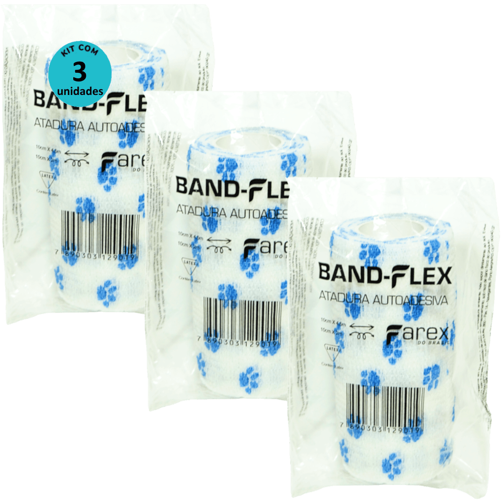 Atadura 10cm Branca Com Patinhas Band-Flex Autoadesiva Para Animais Farex Kit Com 3