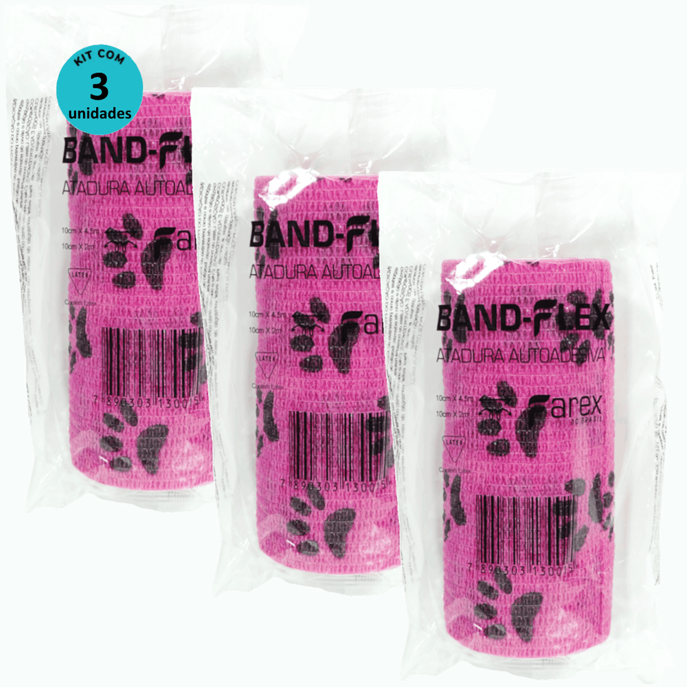 Atadura 10cm Rosa Com Patinhas Band-Flex Autoadesiva Para Animais Farex Kit Com 3