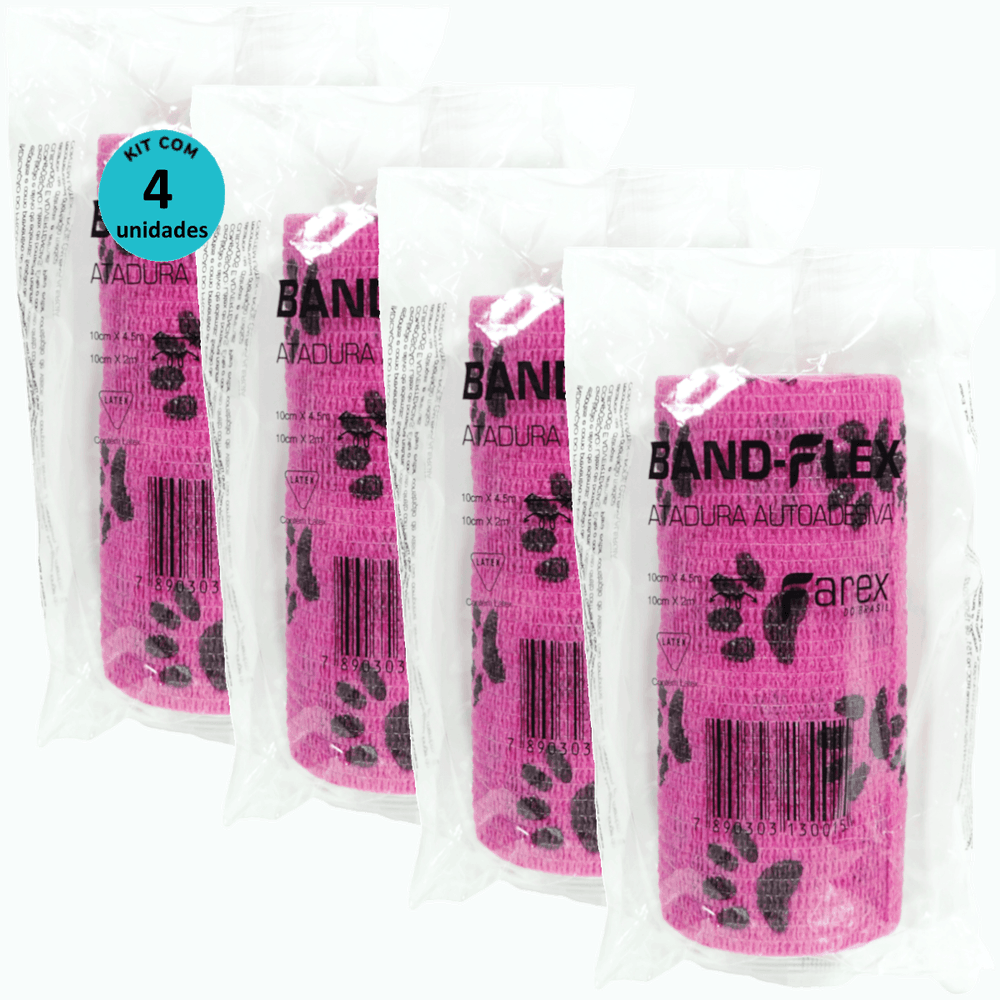 Atadura 10cm Rosa Com Patinhas Band-Flex Autoadesiva Para Animais Farex Kit Com 4