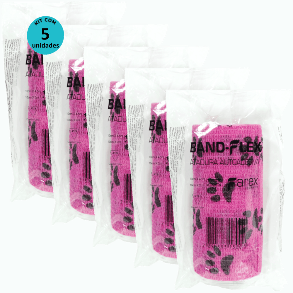 Atadura 10cm Rosa Com Patinhas Band-Flex Autoadesiva Para Animais Farex Kit Com 5