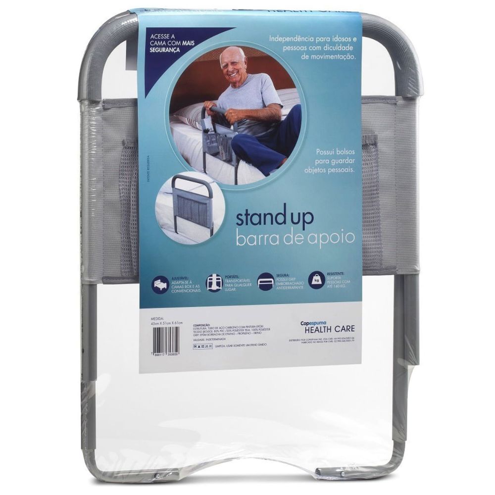 Barra de Apoio Lateral para Cama Stand Up CopespumaA Barra de Apoio Lateral para Cama Stand Up Copespuma é a solução perfeita para garantir mais segurança e independência para idosos e pessoas com mobilidade reduzida. Projetada para auxiliar ao acessar ou sair da cama, proporciona conforto e praticidade no dia a dia, permitindo movimentos mais seguros e sem esforço.Por que escolher a Barra de Apoio Copespuma?✔ Maior segurança: Suporte firme e estável para movimentos como sentar-se e levantar-se da cama.✔ Grip emborrachado antiderrapante: Garante aderência e conforto durante o uso.✔ Bolso prático: Mantenha seus objetos essenciais ao alcance, como controles, óculos e livros.✔ Resistente: Suporta até 140 kg, ideal para alavancagem segura ao sair da cama.✔ Portabilidade: Leve, fácil de transportar e usar em diferentes ambientes e tipos de cama.✔ Fácil instalação: Sem necessidade de ferramentas ¿ basta posicionar sob o colchão.✔ Adaptável: Compatível com camas box e convencionais.Principais Benefícios:✔ SEGURANÇA: Grip antiderrapante para estabilidade e confiança ao levantar-se.✔ PRATICIDADE: Design compacto e funcional, ideal para o uso diário.✔ VERSATILIDADE: Pode ser usada em qualquer tipo de cama (exceto ajustáveis).✔ RESISTÊNCIA: Suporta até 140 kg com estrutura robusta e durável.Composição:Estrutura: Tubo de aço carbono com pintura epóxi, resistente à corrosão.Bolso: Fabricado em PVC e poliéster, resistente e fácil de limpar.Grip: Borracha EPDM, proporcionando maior conforto e aderência.Especificações Técnicas:Dimensões (L x A x P)45 x 51 x 61 cmPeso SuportadoAté 140 kgCompatibilidadeCamas box e convencionaisMaterialAço carbono com acabamento epóxiAtenção ⚠Este produto é indicado para facilitar o acesso à cama. Não deve ser utilizado como grade de proteção ou em camas ajustáveis.Para mais informações sobre o manuseio e cuidados, consulte o manual de uso. Imagem meramente ilustrativa. Descrição de responsabilidade do fabricante.Modelo: Padrão;Tamanho: Padrão;Cor: Padrão;