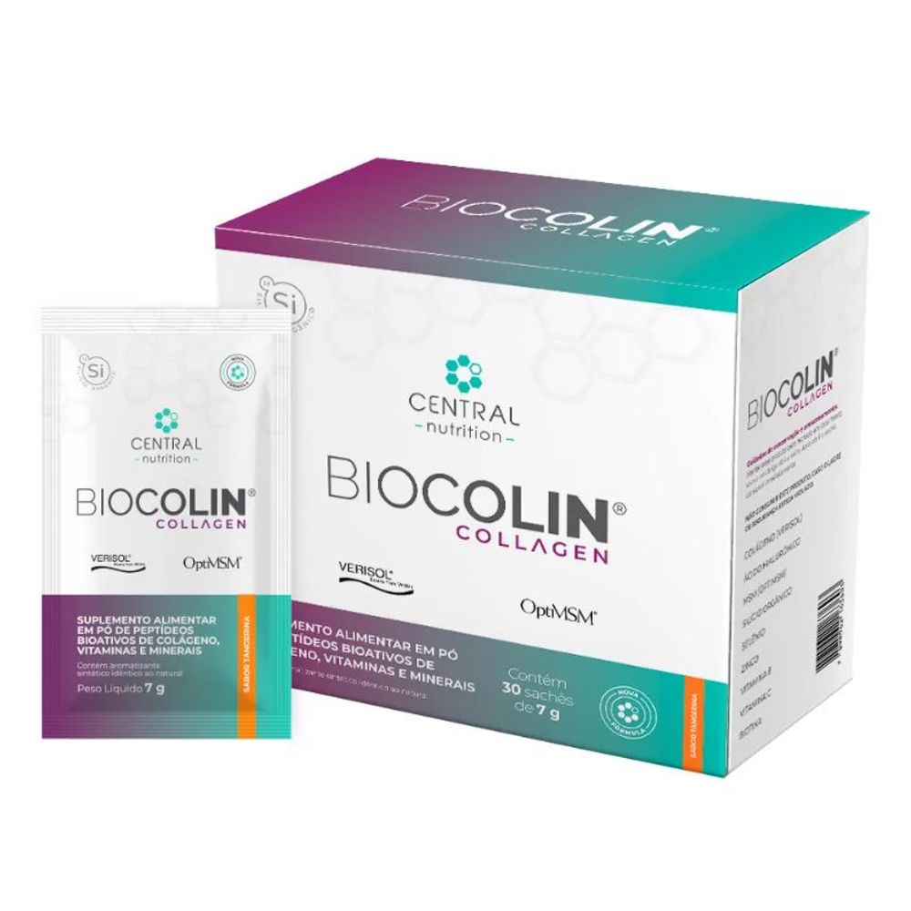 BIOCOLIN COLLAGEN® É O COLÁGENO DOS COLÁGENOS, porque ele é o resultado da unificação de 10 ingredientes fundamentais para transformar sua pele.Mais vitalidade com o poder do colágenoCom o passar dos anos, a produção de colágeno no organismo diminui, resultando na perda de elasticidade e firmeza da pele. Isso leva ao aparecimento de rugas e linhas de expressão. O BIOCOLIN® COLLAGEN é um suplemento alimentar formulado com peptídeos bioativos de colágeno (Verisol®) e mais nove ativos que auxiliam na formação de colágeno e na manutenção da saúde da pele. Beleza além do tempo: revele sua beleza de dentro para fora O cuidado com a pele deve começar de dentro para fora. Nutrientes essenciais estimulam a produção natural de colágeno, proporcionando hidratação, nutrição e revitalização. Com BIOCOLIN® COLLAGEN, você pode reduzir os sinais do envelhecimento e manter uma aparência jovem por mais tempo. Ingredientes-chave para uma pele radianteColágeno e Ácido HialurônicoO Verisol® é um colágeno em peptídeos altamente absorvível que estimula a produção de colágeno natural.O ácido hialurônico promove hidratação intensa e melhora a textura da pele.Quando combinados, esses ativos garantem firmeza, elasticidade e suavização de rugas.CisteínaAuxilia na produção de colágeno e glutationa, proporcionando firmeza e proteção antioxidante.Vitaminas essenciaisVitamina C e E: Poderosos antioxidantes que combatem radicais livres e participam na síntese de colágeno.Vitamina B7 (Biotina): Contribui para a saúde da pele, cabelos e unhas.Minerais fundamentaisZinco: Essencial para a renovação celular e proteção antioxidante.Silício: Importante para a formação de colágeno e elastina, promovendo firmeza e elasticidade.Enxofre (Cisteína e Metionina): Essencial na produção de colágeno e queratina, ajudando a manter a hidratação e a barreira protetora da pele.BIOCOLIN® COLLAGEN com Verisol®: Ciência a favor da sua pele O Verisol® é o único peptídeo bioativo de colágeno com alegação aprovada pela ANVISA para a manutenção da saúde da pele. Estudos clínicos indicam que a suplementação diária de 2,5 g de peptídeos de colágeno Verisol® oferece benefícios comprovados, como: Melhora da elasticidade da peleRedução de rugas e celuliteHidratação profundaBenefícios do BIOCOLIN® COLLAGEN2,5 g de Peptídeos bioativos de colágeno Verisol®Auxilia na manutenção da saúde da peleAção antioxidante poderosaFonte de aminoácido L-CisteínaFonte de BiotinaAuxilia na formação de colágenoModo de preparo Adicione um sachê (7 g) em aproximadamente 200 ml (1 copo) de água e misture até completa dissolução. Consuma imediatamente. Recomendação de uso: Adultos (a partir de 19 anos) devem consumir um sachê ao dia ou conforme orientação de um profissional da saúde.