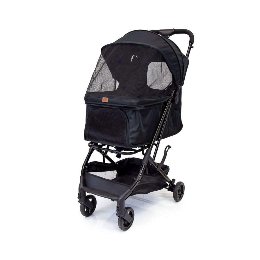 Tem colchonete confortável e com capa lavável, mais segurança com os ganchos duplos para prender um ou dois cachorros, capota ampla, retrátil e com tela de proteção acoplada, prende com velcros use aberta ou fechada, manopla emborrachada, fechamento compacto com apenas uma das mãos, alça de mão para carregar, freios, rodas dianteiras com giro 360° e trava de movimento, bolsos laterais e traseiro para pequenos itens e cesto porta-objetos, 2 tipos de abertura frontal traseira, com telas para deixar mais arejado e visível. Confeccionado em tecido fácil de limpar que pode ser removido para lavar à máquina em ciclo delicado.