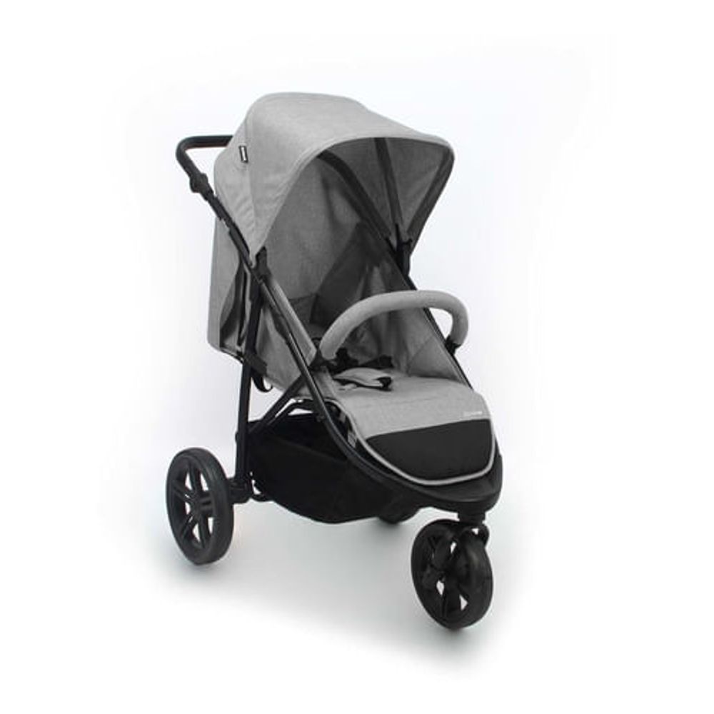Um carrinho de 3 rodas que possui assento que reclina por completo, em múltiplas posições, para que o bebê passeie ou durma de forma confortável.