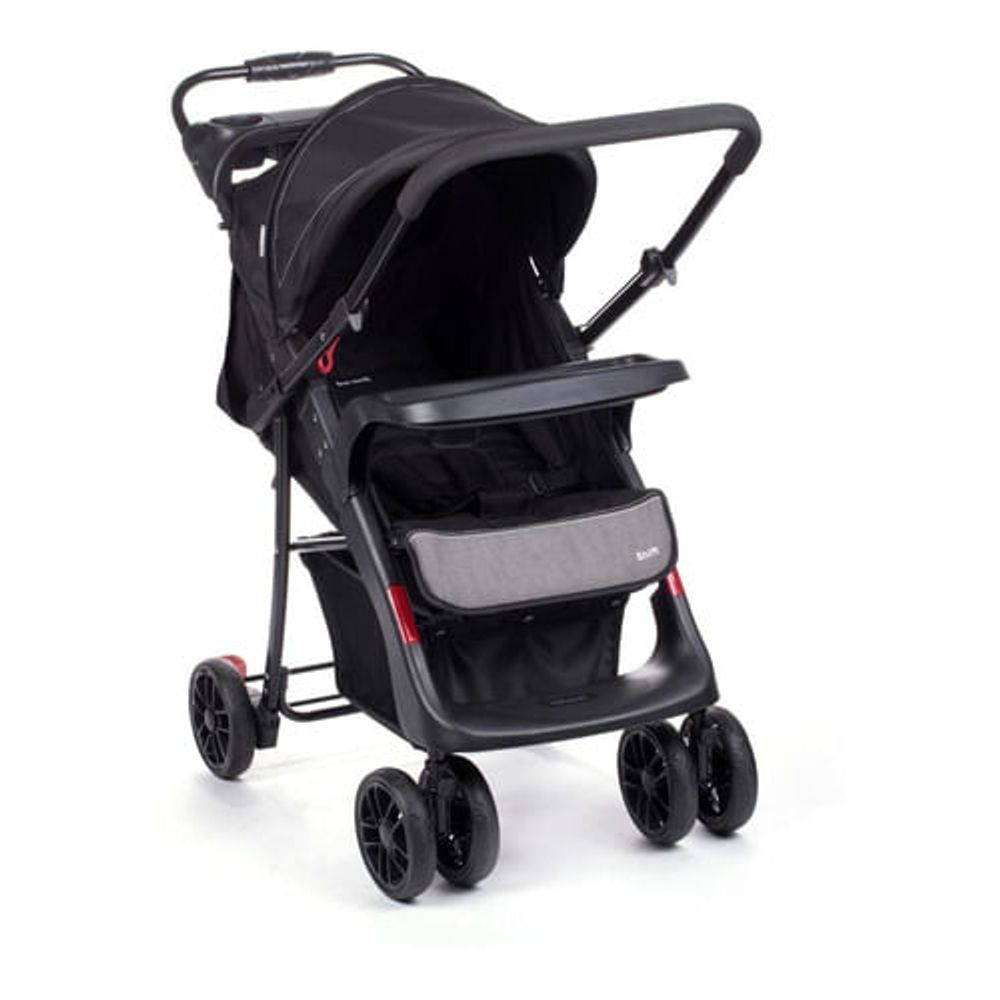 Carrinho de bebê com alça reversível, fechamento com apenas uma mão e assento com modo de descanso. Possui bandeja superior para os pais e frontal para a criança.
