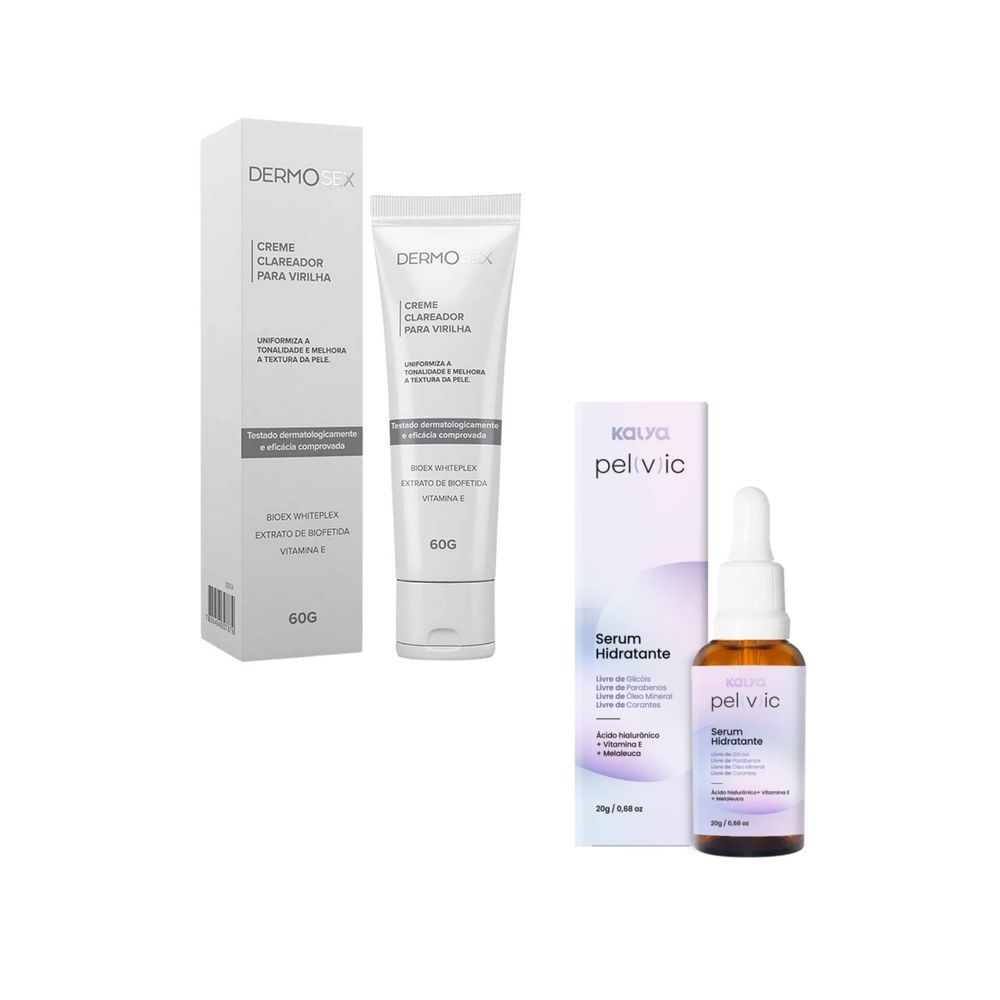 Kit Contendo:1- Sérum Para Região Pélvica Íntima Externa e Corpo Kalya Pelvic1- Clareador de Virilha e Axila Dermosex Os cosméticos tradicionais funcionam com ação instantânea, mas não atuam nas reais causas dos problemas. Os dermocosméticos passam por testes e pesquisas científicas garantindo a segurança e eficácia. Esse Kit irá ajudar no cuidado e tratamento da pele da sua região íntima. Observarção: O Sérum Kalya Pelvic poderá ser utilizado em toda a parte Externa da região íntima (vulva) enquanto o clareador de virilha deve ser utilizado apenas na parte de pele seca íntima (virilha, extre coxas e etc) evitando áreas de mucosa .Como usar: Utilize o Clareador Dermosex a noite antes de dormir. O Serum Kalya Pelvic pode ser utilizado em qualquer horario do dia. Faça uma esfoliação no local pelo menos 2x na semana.Veja a seguir as informações de cada produto individualmente:-----------------------------------------------Creme Clareador de Virilha Dermosex 60g Creme Clareador Intimo para Virilha é para uso tanto masculino quanto feminino. Creme para aplicação corporal que clareia e uniformiza o tom da pele, principalmente na área das virilha.De acordo com a ANVISA, os dermocosméticos são produtos que em sua composição possui substâncias e ativos terapêuticos que além da epiderme, atingem as camadas mais profundas da pele, garantindo um melhor resultado, como no tratamento anti-idade, manchas na pele e cicatrizes. Ou seja, promove alterações fisiológicas e melhoram a aparência da pele.O Creme Clareador Dermosex previne rugas. Melhora a cicatrização. Aumenta a firmeza da pele, já que participa da formação do colágeno. Age como lubrificante e hidratante potente para a pele.Para quais tipos de pele:Todos os tipos de pelePrincipais benefícios:Ação calmanteClareia e uniformiza o tom de pelePode ser usado no verãoAtivos do produto:Bioex Whiteplex, Extrato de Biofoetida, Vitamina EREGISTRO ANVISA: AFE 2.03.200-7 N° Processo 25351.036147/2020-31------------------------------------Serum Hidratante Kalya Pelvic 20gExplore a revolução da beleza com o inovador Serum Hidratante Pelvic Kalya, especialmente formulado para rejuvenescer, tratar e revitalizar não apenas a pele da região do corpo e da face, mas também cuidar delicadamente da região Íntima Externa aliviando a irritação e o desconforto, mantendo-a fresca e protegida ao longo do dia.Pensando em praticidade em um único produto, a Kalya desenvolveu o Serum Hidratante da Linha Pelvic com uma fórmula exclusiva que pode ser utilizado na parte íntima externa, vul va, virilha, partes do corpo como axilas, joelhos cotovelos, incluindo a região do rosto.Tudo isso porque esse produto possui ativos reconhecidos pelas suas qualidades de hidratação, nutrição, rejuvenescimento, antirradicais livres e antissépticas. Como no caso do: Ácido Hialurônico, Óleo Essencial de Melaleuca, Extrato de Algas Marinhas e Vitamina E. Toda sinergia está aliada a uma composição extremamente suave e delicada, com PH equilibrado totalmente livre de glicóis, parabenos, óleo mineral e corantes. Com uma textura cremosa e aveludada deixará sua pele com aroma agradável e com aparência mais jovem.PRINCIPAIS BENEFÍCIOS:Fórmula Exclusiva: Desenvolvida com ingredientes de alta qualidade, livre de substâncias químicas agressivas, garantindo uma experiência suave e eficaz para todos os tipos de pele.Versatilidade Incomparável: Do cuidado íntimo à revitalização facial, o Serum Pelvic Kalya atende às necessidades de beleza de todo o seu corpo, simplificando sua rotina de cuidados pessoais.Hidratação Profunda: Enriquecido com agentes hidratantes, o serum proporciona uma hidratação profunda e duradoura, deixando sua pele macia, suave e radiante.Rejuvenescimento Intenso: Com propriedades antioxidantes e regenerativas, o produto ajuda a reduzir os sinais de envelhecimento, promovendo uma aparência jovem e saudável.PH Balanceado: Cuidadosamente formulado para respeitar o pH natural da sua pele íntima, o serum ajuda a manter o equilíbrio delicado dessa região sensível.Fragrância Suave: Possui uma fragrância suave e discreta, ideal para uso diário, sem interferir na sua rotina de fragrâncias pessoais.ANVISA: AFE 2.02.756-2 PROCESSO 25351.012401/2024-39------------------------------------------Tags de Pesquisa: tratamento para flacidez íntima, tratamento para flacidez dos grandes lábios, hidratante intimo, melhor hidratante íntimo feminino, creme hidratante para partes íntimas, hidratante intimo feminino, gel hidratante íntimo externo, hidratante íntimo externo, gel íntimo hidratante, gel hidratante íntimo masculino, hidratante íntimo à base de água, gel hidratante externo preço, clareador intimo, creme clareador intimo, clareador de partes intimas, clareamento íntimo preço, clareador partes intimas, clareamento região íntima, creme clareador partes intimas, clareador para partes intimas, creme clareador de partes intimas, tratamento para clarear partes intimas, clareador virilha, clarear virilha, clareador de virilha, creme para clarear virilha, creme para clarear virilha, creme clareador de virilha