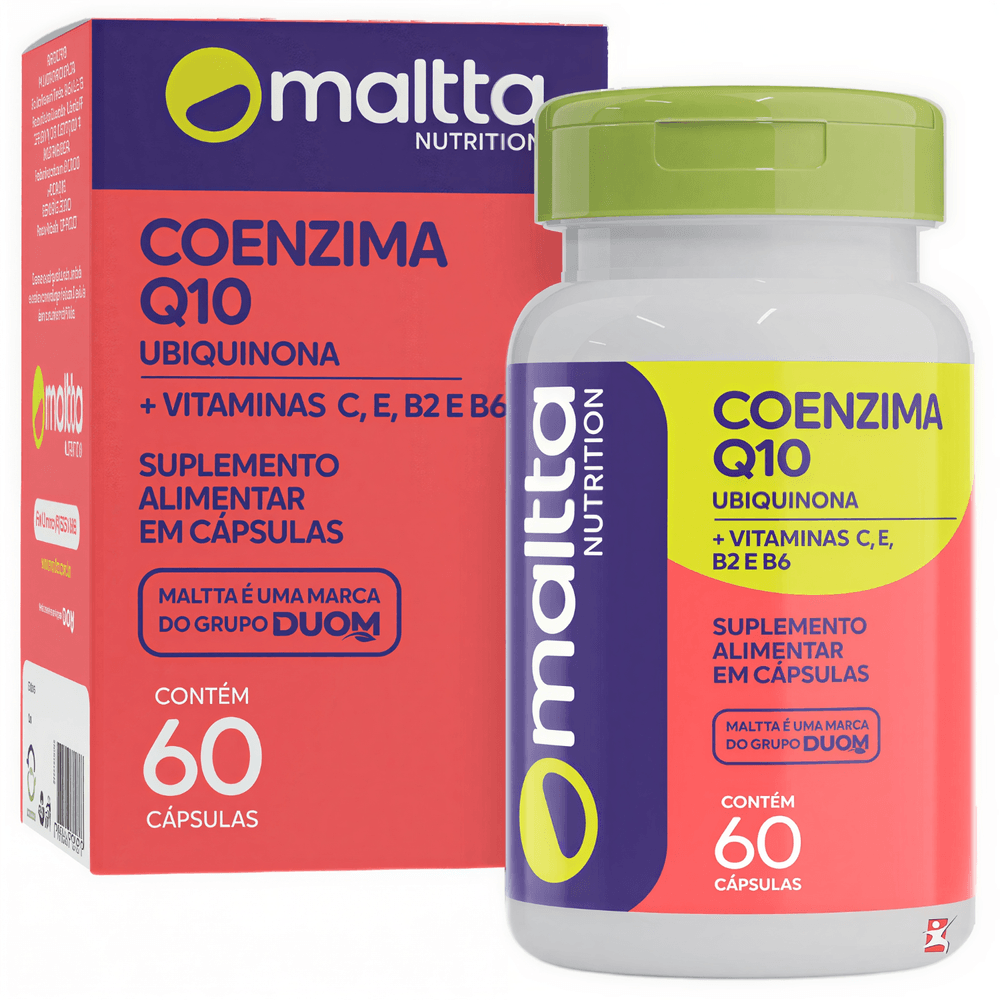 COENZIMA Q10 + VIT C + VIT E + VIT B2 + VIT B6 60 CAPSULAS – MALTTA NUTRITION DESCRIÇÃOA CoQ10 com vitaminas, possui em sua formulação o benefício da coenzima Ubiquinona aliada as vitaminas C, E, B2 e B6.A coenzima Q10 (ubiquinona) é uma enzima produzida naturalmente no corpo, mas que a partir dos 30 anos a sua produção começa a ser reduzida.  BENEFÍCIOS- Antioxidante;- Suporte à saúde cardiovascular;- Enriquecido com vitaminas: C, E, B2 e B6;- Absorção aprimorada;- Promove a saúde do sistema imunológico; SUGESTÃO DE USOTomar 1 cápsula ao dia. TABELA NUTRICIONAL & COMPOSIÇÃOAnexo nas imagens do anúncio RECOMENDAÇÕES & CUIDADOSPRODUTO INDICADO A PESSOAS ACIMA DE 19 ANOS. ESTE PRODUTO NÃO DEVE SER CONSUMIDO POR GESTANTE, LACTANTE E CRIANÇAS. ESTE PRODUTO NÃO É UM MEDICAMENTO. NÃO EXCEDER A RECOMENDAÇÃO DIÁRIA DE CONSUMO INDICADO NA EMBALAGEM. MANTENHA FORA DO ALCANCE DE CRIANÇAS. DADOS TÉCNICOSMarca – Duom.Conteúdo líquido total – 60 cápsulas.Rendimento líquido total – 60 doses/porções.Peso líquido total – 24g.Peso produto + embalagem (aproximado) – 200g.Código de barras (EAN) – 7898665751817.Registro ANVISA – Dispensado de registro de acordo com a resolução da RDC 27/2010 e RDC 240/2018 da ANVISA.Dimensões do produto – altura 11 cm; largura 6 cm; comprimento 6 cm.Dimensões da embalagem padrão – altura 7 cm; largura 13 cm; comprimento 16cm. ITENS DO ANÚNCIO- 1 Unidade do produto: COENZIMA Q10 + VIT C + VIT E + VIT B2 + VIT B6 60 CAPSULAS – MALTTA NUTRITION.Total – 60 Cápsulas POR FRASCO.