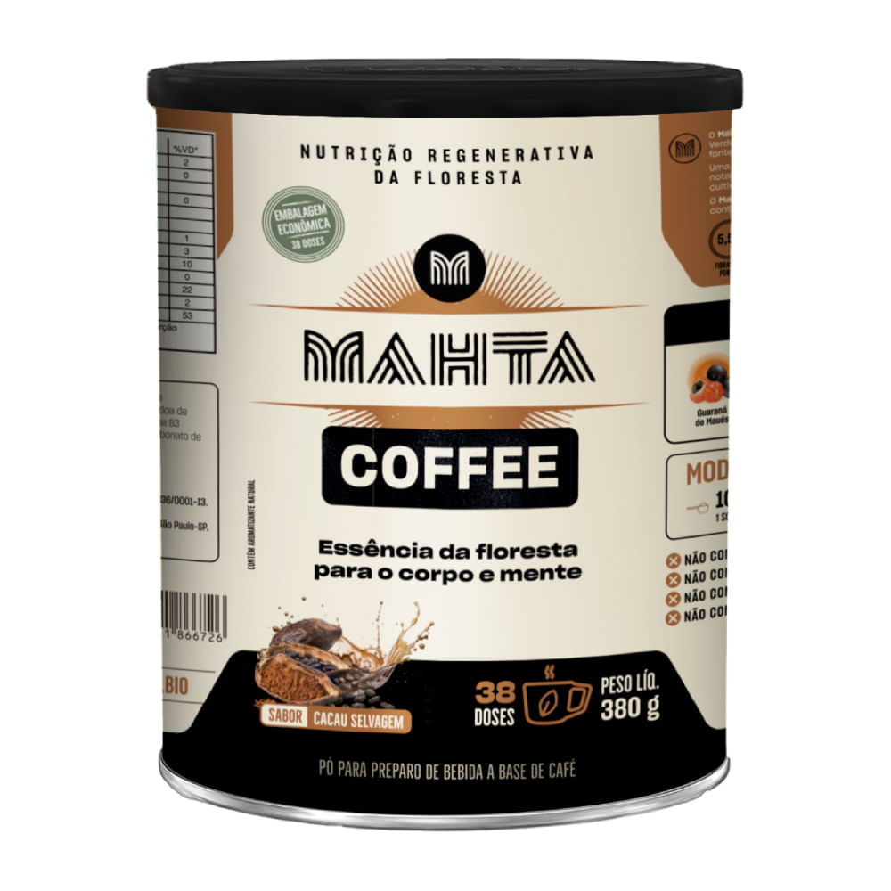 O Mahta Coffee sabor cacau selvagem da Mahta é um café funcional solúvel que une tradição e inovação. Elaborado com guaraná, café verde, cacau, TCM em pó e outros ingredientes, é 100% livre de maltodextrina e combina sabor marcante com a riqueza da floresta._x000D_ Sobre os ingredientes:_x000D_ _x000D_ Guaraná de Maués: cultivado de forma artesanal, é um ingrediente naturalmente rico em cafeína._x000D_ Café Verde de Apuí: primeiro café orgânico agroflorestal da Amazônia. Possui alto teor de antioxidantes, que atuam combatendo os radicais livres._x000D_ Marapuama: planta tradicionalmente utilizada por povos da floresta, associada ao bem-estar e ao vigor físico._x000D_ _x000D_ Sugestão de consumo:_x000D_ Misture 10g (1 scoop) em 100ml de água quente e consuma pela manhã, ou conforme orientação do nutricionista._x000D_ Motivos para escolher o produto:_x000D_ _x000D_ _x000D_ Sem glúten e sem lactose;_x000D_ _x000D_ _x000D_ Produto vegano;_x000D_ _x000D_ _x000D_ Pode ser consumo como pré-treino, antes do trabalho, para estudar ou para manter o jejum metabólico;_x000D_ _x000D_ _x000D_ Elaborado com superfoods amazônicas;_x000D_ _x000D_ _x000D_ Contém fibras prebióticas – ajudam na função intestinal_x000D_ _x000D_ _x000D_ Sem adição de açúcares;_x000D_ _x000D_ _x000D_ Baixo teor de carboidratos;_x000D_ _x000D_ _x000D_ Adoçado com stévia – adoçante natural;_x000D_ _x000D_ _x000D_ Rende 38 doses._x000D_ _x000D_ _x000D_ A Marca_x000D_ A Mahta nasceu com o propósito de reconectar pessoas às suas origens, unindo nutrição, saberes ancestrais e ciência moderna por meio de superalimentos amazônicos. A empresa desenvolveu o Sistema Regenerativo da Floresta (SRF), que integra saúde, justiça social e combate às mudanças climáticas. Seu trabalho valoriza comunidades tradicionais, remunera de forma justa extrativistas e agroflorestais, e promove práticas sustentáveis. Com ingredientes puros e rastreáveis, a Mahta alia inovação e preservação da floresta, transformando paixão em um movimento regenerativo.Sem Glúten: Sim;Sem Açúcar: Sim;Veganos: Sim;Sem Lactose: Sim;Glúten: Não Contém;Lactose: Não Contém;