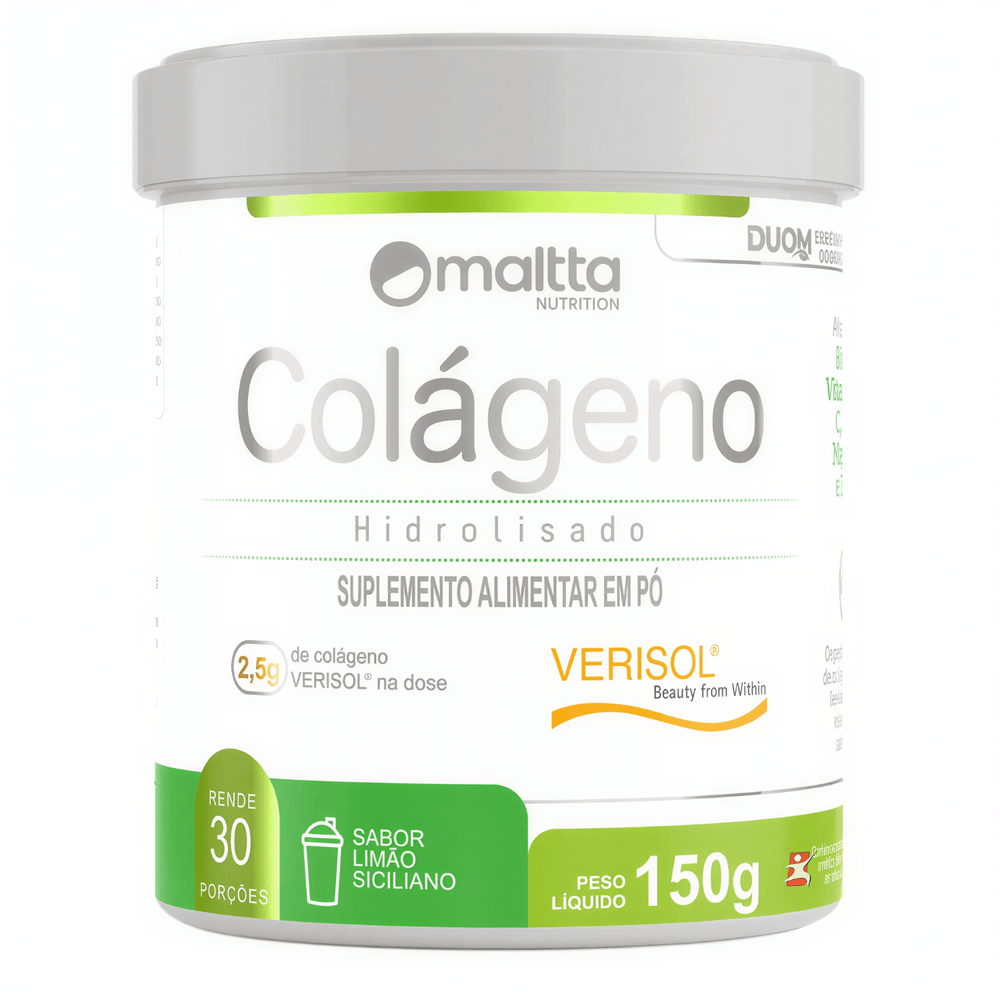 COLÁGENO HIDROLISADO VERISOL + VITAMINAS + MINERAIS LIMÃO SICILIANO 150G - MALTTA NUTRITION — descrição do produto — INDÚSTRIA DO CORPOVERISOL® é um produto inovador, de uso oral, especialmente desenvolvido para auxiliar nos cuidados com a saúde e a beleza da pele, é único do mundo a ter sua eficácia comprovada cientificamente. Tecnologia Alemã agora disponível no Brasil. O Colágeno Hidrolisado VERISOL da DUOM contém Biotina Selênio e Zinco e também é enriquecido com Vitamina E, Vitamina B6, Vitamina D e Vitamina C.VITAMINA C é essencial para a síntese de colágeno fazendo com que você aproveite ao máximo os benefícios da suplementação com Colágeno VERISOL®. Ele combate os sinais do envelhecimento agindo de dentro para fora e foi desenvolvido a partir de uma série de estudos e pesquisas que originaram uma combinação única de Peptídeos Bioativos de Colágeno que atuam nas camadas mais profundas da pele onde, normalmente, produtos antienvelhecimento disponíveis no mercado não conseguem alcançar. Durante o processo natural de envelhecimento, em associação com outros fatores ambientais e nutricionais, a derme, principal camada de atuação do Colágeno VERISOL®, sofre com a perda de umidade e fica mais seca. Por conta disto, ela fica mais fina, a ligação do tecido conjuntivo perde sua firmeza e elasticidade, e as rugas aparecem. O Colágeno VERISOL consegue desacelerar esse processo de envelhecimento. Além disso, novos estudos realizados com o exclusivo Colágeno VERISOL também comprovaram que a sua suplementação contribui para a redução da celulite e o crescimento de unhas mais fortes e bonitas. Sua fórmula patenteada garante a exclusividade deste incrível produto que apresenta resultados cientificamente comprovados com o consumo diário. — benefícios — INDÚSTRIA DO CORPO- Cada dose fornece 2,5g de Colágeno Verisol®;- Fonte de Biotina, Selênio e Zinco;- Fonte de Vitamina B6, E, C e D;- Manutenção, crescimento, fortalecimento e melhora dos cabelos;- Manutenção e melhora da pele;- Combate os radicais livres;- Melhora no funcionamento do sistema imunológico;- Auxilia na formação do colágeno;- Auxilia na absorção do cálcio e fósforo. — sugestão de uso — INDÚSTRIA DO CORPO Dissolver 1 colher de sopa rasa (10g) do Colágeno Duom em 200ml de água. Misture até dissolver totalmente e consuma logo em seguida. — tabela nutricional — INDÚSTRIA DO CORPOEM ANEXO NAS IMAGENS. — composição — INDÚSTRIA DO CORPOColágeno Hidrolisado, Colágeno Hidrolisado (Verisol®), Bisglicinato de Zinco, Vitamina C, Vitamina E, Selenometionina, Vitamina B6, Biotina e Vitamina D. Aroma Sintético de Limão Siciliano, Acidulante Ácido Cítrico, Antiumectante Dióxido de Silício e Edulcorante Artificial Sucralose.NÃO CONTÉM GLÚTEN. — recomendações — INDÚSTRIA DO CORPOEM ANEXO NAS IMAGENS. — dados técnicos — INDÚSTRIA DO CORPO Marca – Duom.Conteúdo líquido total – 200g.Rendimento total – 20 porções/doses.Peso aproximado produto + embalagem - 300g.Código de barras (EAN) – 7898665750858.Registro ANVISA – Dispensado de registro de acordo com a resolução da RDC 27/2010 e RDC 240/2018 da ANVISA.Dimensões do produto – largura: 10 cm; altura: 13 cm; comprimento: 10 cm.Dimensões da embalagem/pacote - largura: 13 cm; altura: 7 cm; comprimento: 16 cm.  — itens do anúncio — INDÚSTRIA DO CORPO- 1 Unidade do produto:COLÁGENO HIDROLISADO VERISOL + VITAMINAS + MINERAIS LIMÃO SICILIANO 150G - MALTTA NUTRITIONTotal – 200g POR PORTE.