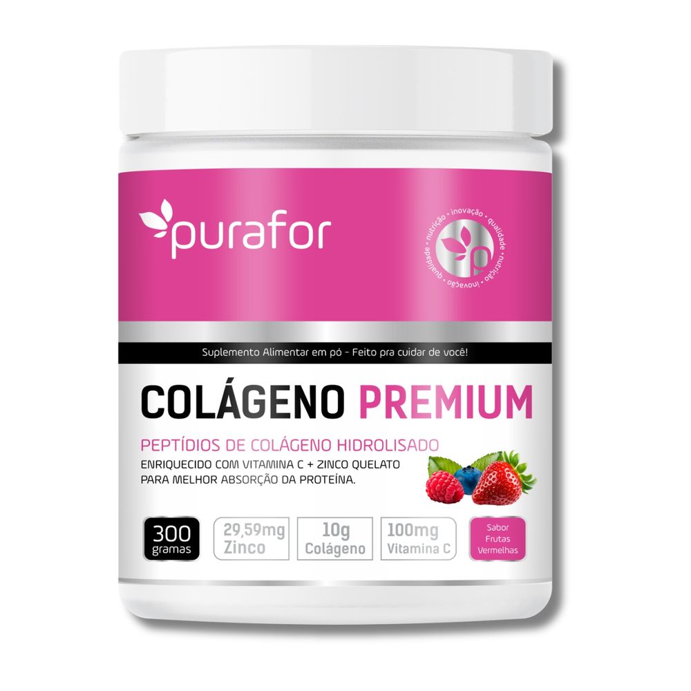 O Colágeno Premium Purafor 200g foi desenvolvido com peptídeos de colágeno hidrolisado de alta absorção, combinados com Vitamina C e Zinco, nutrientes essenciais para auxiliar na saúde da pele, cabelos, unhas e articulações.Sua fórmula contribui para estimular a produção natural de colágeno no organismo, ajudando na elasticidade da pele, fortalecimento das unhas e manutenção das articulações. Ideal para quem busca beleza, saúde e bem-estar em um único suplemento.? Auxilia na elasticidade e firmeza da pele? Contribui para fortalecimento de cabelos e unhas? Suporte para articulações e mobilidade? Colágeno hidrolisado de fácil absorção? Enriquecido com Vitamina C e Zinco? Suplemento prático para consumo diárioPeptídeos de colágeno hidrolisado, vitamina C e zinco, combinação ideal para potencializar os benefícios do colágeno no organismo.Diluir 1 dosador em 150ml a 200ml de água, consumir 1 vez ao dia ou conforme orientação de profissional de saúde.• Conteúdo: 200g• Tipo: Colágeno Hidrolisado Premium• Uso diário• Alta absorção   IngredientesColágeno hidrolisado, aroma natural de frutas vermelhas, ácido cítrico, Ácido Hialurônico (Hialuronato de Sódio obtido pela fermentação de Streptococcus zooepidemicus), Vitamina C (ácido ascórbicos), Bisglicinato de Zinco, Silicio (Ácido Ortosilicico estabilizado em Maltodextrina), e D-Biotina. NÃO CONTÉM GLUTÉM Modo de ConservaçãoConservar este produto bem fechado, em lugar fresco, seco e ao abrigo da luz, calor e umidade. Após aberto, consumir o produto em até 30 dias.  Produto indicado para o grupo populacional Adulto 19 anos.“Este produto não é um medicamento”.“Não exceder a recomendação diária de consumo indicada na embalagem”.“Este produto não deve ser consumido por gestantes, lactantes e crianças”.“Mantenha fora do alcance das crianças”.Registro Anvisa:Produto comunicado a Anvisa e dispensado da obrigatoriedade de registro conforme RDC 240/18 e 243/18.