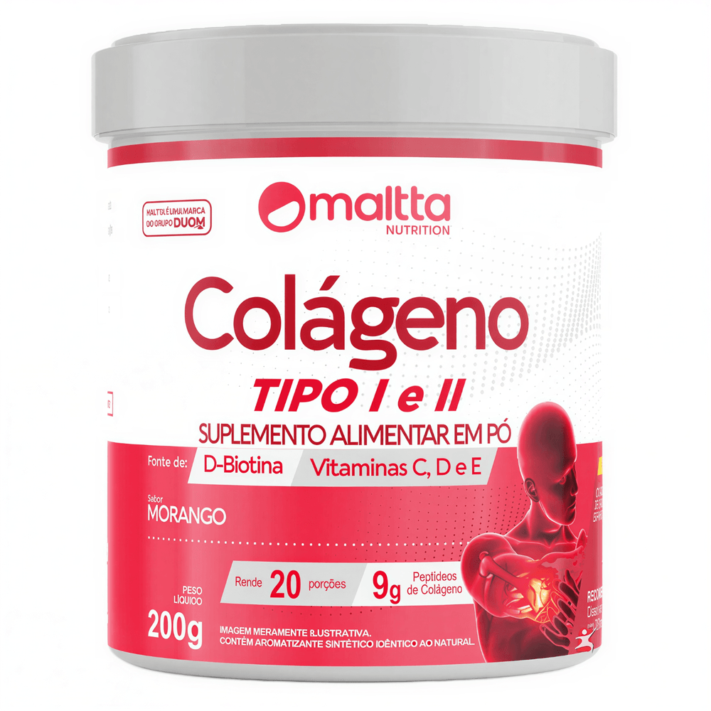 COLÁGENO TIPO 1 E 2 + BIOTINA + VITAMINAS E + C + D 200G MORANGO - MALTTA NUTRITION — descrição — INDÚSTRIA DO CORPOColageno Tipo 1- Hidrolisado e Colágeno Tipo 2- Não desnaturado.O colágeno não desnaturado auxilia na manutenção da função articular.As proteínas auxiliam na formação dos músculos e ossos.A Biotina contribui para a manutenção do cabelo e pele.A Vitamina C e a Vitamina E são antioxidantes que auxiliam na proteção dos danos causados pelos radicais livres.A Vitamina C auxilia no funcionamento do sistema imune e na formação do colágeno.A vitamina D auxilia na absorção de cálcio e fósforo. — benefícios — INDÚSTRIA DO CORPO- Colágeno Hidrolisado Tipo I;- Colágeno não Desnaturado Tipo II;- Manutenção da função articular;- Auxilia na formação dos músculos e ossos;- Manutenção, crescimento, fortalecimento e melhora dos cabelos;- Manutenção e melhora da pele;- Combate aos radicais livres;- Melhora no funcionamento do sistema imunológico;- Auxilia na formação do colágeno;- Auxilia na absorção do cálcio e fósforo. — sugestão de uso — INDÚSTRIA DO CORPODissolver 1 colher de sopa rasa (10g) do Colágeno Tipo I e II Duom em 200ml de água. Misture até completa dissolução e consuma logo em seguida. — tabela nutricional — INDÚSTRIA DO CORPO**INFORMAÇÃO NUTRICIONAL – EM ANEXO NAS IMAGENS** — composição — INDÚSTRIA DO CORPOColágeno Hidrolisado, Vitamina C, Colágeno Tipo II não desnaturado , Vitamina E (Acetato D-Alpha-Tocoferol), D-Biotina e Vitamina D3. Aroma Sintético de Morango, Acidulante Ácido Cítrico, Antiumectante Dióxido de Silício, Edulcorante Artificial Sucralose e Corante Natural Carmin. — recomendações —EM ANEXO NAS IMAGENS. — dados técnicos — INDÚSTRIA DO CORPOMarca – Duom.Conteúdo líquido por frasco – 200 g.Rendimento por frasco – 20 porções/doses.Peso líquido por frasco – 200 g.Código de barras (EAN) – 7898665750902.Registro ANVISA – Dispensado de registro de acordo com a resolução da RDC 27/2010 e RDC 240/2018 da ANVISA.Dimensões do produto – altura: 10 cm; largura: 6 cm; comprimento: 6 cm. — itens do anúncio — INDÚSTRIA DO CORPO1 Unidade do produto:COLÁGENO TIPO 1 E 2 + BIOTINA + VITAMINAS E + C + D 200G MORANGO - MALTTA NUTRITION- Total – 200 g CADA POTE.