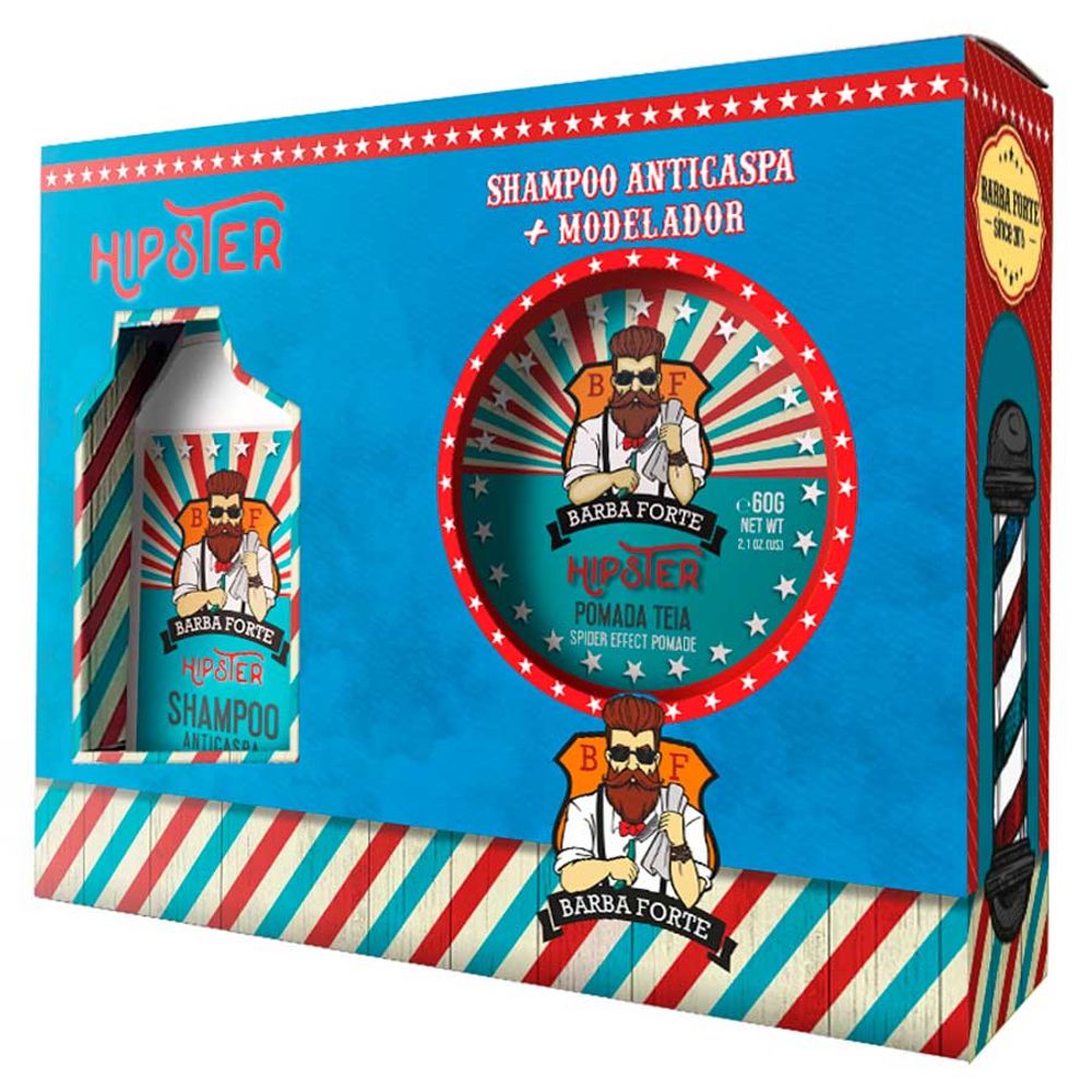 O Shampoo Anticaspa Hipster Barba Forte conta com ativos específicos para tratamento e combate à caspa e possui extratos como Óleo de Jojoba que ajudam a reduzir o excesso de oleosidade do couro cabeludo além de ter ação emoliente, umectante e restauradora.   Modo de usar:  Aplique o Shampoo Anticaspa na barba ou cabelo e espalhe com movimentos circulares. Enxágue. Se necessário, repita a operação.  Composição em Português: Aqua, Sodium Lauryl Sulfate, Cocamidopropyl Betaine, Cocamide DEA, Glycerin, Polyquaternium 7, Propylene Glycol, Hydrolyzed Keratin Parfum, Jojoba Oil, Disodium Edta, Bht, Limonene, Methylpropanediol, Propanedio, Ziziphus Joazeiro Bark Extract, Dmdm Hydantoin, Iodopropynyl Butylcarbamate, Citric Acid, Calcium Gluconate, Citronellol, Coumarin, Linalool, Citral, Limonene, Methyl 2-Octynoato, Geraniol.   A pomada Teia Hipster Barba Forte conta com alto poder de fixação permitindo definir e fixar seu penteado com efeito natural auxiliando no controle do frizz. Modo de uso: Com os cabelos secos aplique uma porção do produto na palma das mãos e espalhe pelos fios em movimentos repetidos até que ganhem a forma desejada. Precauções: Manter fora do alcance de crianças. Em caso de contato com os olhos, lavar com água em abundância. Manter o produto em local fresco e ao abrigo de luz solar. Uso Externo.   Itens inclusos: 01 - Shampoo (Tamanho Viagem) AntiCaspa Hipster Barba Forte 90ml01 - Pomada Teia Hipster Barba Forte 60g