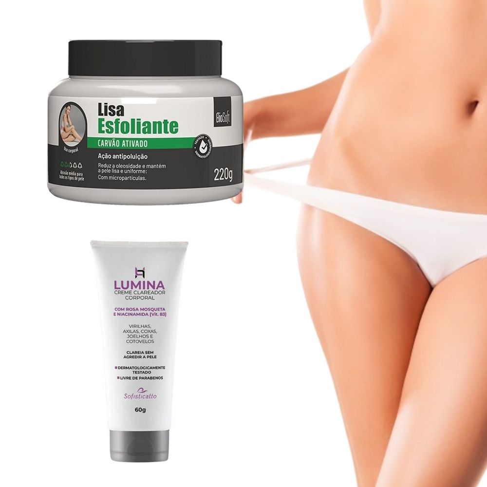 Kit Clareador de Virilha e Axila: Esfoliante de Carvão Ativado Bio Soft + Creme Clareador com Rosa Mosqueta LuminaVocê está em busca de um clareamento de virilha e axilas eficaz? O Kit Clareador combina o poder do esfoliante de carvão ativado e do creme clareador com rosa mosqueta, ajudando a reduzir manchas escuras e deixando sua pele mais uniforme e macia.Esfoliação profunda – O Esfoliante de Carvão Ativado Bio Soft remove células mortas, desobstrui os poros e melhora a absorção dos ativos clareadores.Clareamento progressivo e seguro – O Creme Clareador de Axilas e Virilha com Rosa Mosqueta Lumina reduz a hiperpigmentação e uniformiza o tom da pele.Se você sofre com manchas na virilha, axilas escuras, joelhos e cotovelos manchados, este tratamento é ideal para você!Como Usar para um Clareamento Rápido e Eficiente?Passo 1 – Esfoliação: Aplique o esfoliante de carvão ativado para axilas e virilha, massageando suavemente por 2 minutos. Enxágue bem.Passo 2 – Clareamento: Antes de dormir e com a pele limpa e seca, aplique o creme clareador de manchas escuras e massageie até completa absorção.Frequência: Utilize o esfoliante 2 a 3 vezes por semana e o creme clareador diariamente para um clareamento rápido e duradouro. Não exponha a área ao sol durante o uso, se necessário, utilize o filtro solar.-------------------------------------------Creme Clareador Lumina 60gO Creme Corporal Lumina possui ingredientes cuidadosamente selecionados como a Rosa Mosqueta, que ajuda a clarear, regenerar e hidratar a pele, além de oferecer ação iluminadora e de antienvelhecimento. A Vitamina B3 presente na fórmula, também oferece ação antioxidante, hidratante, além de combater o envelhecimento precoce da pele.Lumina é livre de parabenos, dermatologicamente testado e clareia sem agredir!PRINCIPAIS BENEFÍCIOSClareia a pele sem agredirCorrige a diferença de tonalidade da regiãoDeixa a pele hidratada e iluminadaLivre de parabenos e dermatologicamente testadoANVISA: Processo 25351.261293/2022-64 AFE: 2.03567.6------------------------------------Esfoliante Carvão Ativado Bio Soft 220gQuer deixar sua pele macia, suave e livre de impurezas? Então experimente o Esfoliante Carvão Ativado Bio Soft com sua ação poderosa e inovadora que ajuda a reduzir a oleosidade excessiva da pele. Possui ação anti poluição, promovendo uma esfoliação profunda, eliminando as células mortas e todas as impurezas causadas pela exposição à poluição diária. Além disso, oferece ação clareadora.Sobre o Ativo Carvão Ativado: O carvão ativado é bastante poroso, tem alta capacidade de absorção e é muito utilizado em casos de intoxicação. Sua composição química tem muita afinidade com agentes oleosos, por isso é um componente fácil de ser encontrado em produtos de combate à oleosidade da pele. Não perca mais tempo com esfoliantes comuns. Experimente agora mesmo o Esfoliante Carvão Ativado Bio Soft e sinta a diferença na sua pele desde a primeira aplicação!PRINCIPAIS BENEFÍCIOS:Possui ação anti poluiçãoPromove esfoliação profundaElimina as células mortasReduz a oleosidade excessiva da pele e impurezasTestado DermatologicamentePROCESSO ANVISA: 25351.701425/2017-18 AUT/MS 201236-1-------------------------------------Principais Tags de Pesquisa:clareador de virilha, clarear virilha, clareamento de virilha, creme para clarear virilha, clarear virilha escura, clareador de axilas, clarear axila, clarear entre as pernas, como clarear as coxas, manchas na coxa, como tirar manchas escuras entre as pernas e virilha, clarear joelhos, como clarear o joelho, como clarear joelhos e cotovelos, clareador de cotovelo, creme para clarear cotovelo, hidratante clareador corporal, clareador íntimo, creme clareador intimo, sofisticatto creme clareador, óleo de rosa mosqueta clareia manchas, rosa mosqueta clareia a pele, rosa mosqueta clareia a pele, creme clareador rosa mosqueta