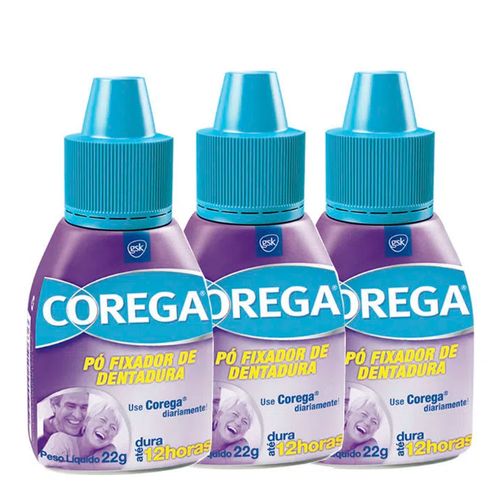 Corega Pó Fixador oferece mais conforto, garantindo uma fixação perfeita das próteses dentárias por até 12 horas. Formulado sem zinco e prático, pode ser utilizado diariamente, proporcionando uma sensação de segurança e bem-estar. Embalagem econômica com 3 unidades.