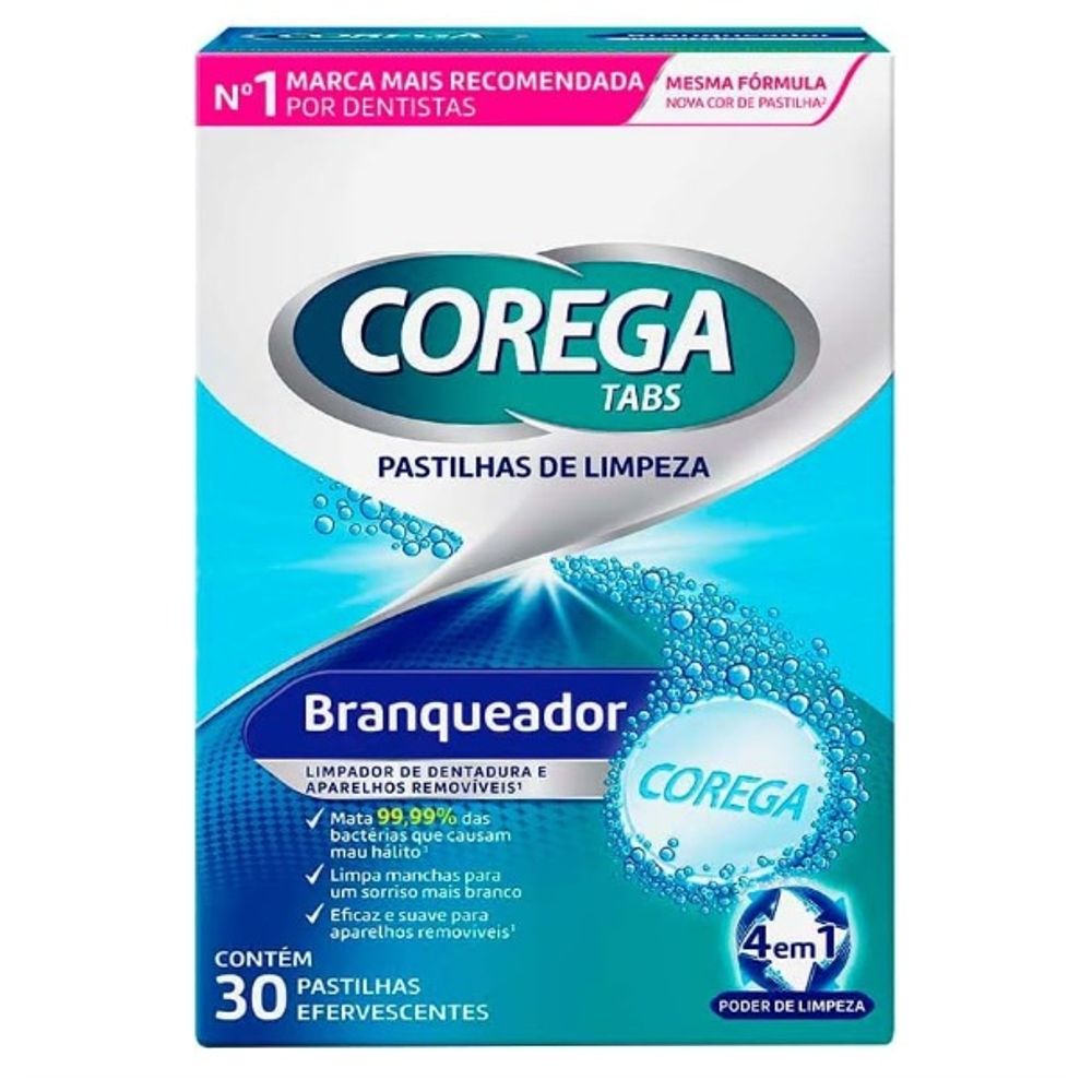 Corega Tabs são projetados para limpar e higienizar próteses dentárias de forma eficaz. Em apenas 15 minutos garante uma limpeza profunda, matando 99,99% das bactérias causadoras do mau hálito As pastilhas de Corega também são eficazes para limpar manchas e trazer um sorriso mais branco, promovendo uma limpeza profunda e proporcionando ação branqueadora Corega Tabs mata 10 vezes mais bactérias do que um creme dental regular e promove uma limpeza profunda sem danificar pois sua fórmula possui baixa abrasividade. Por isso, limpa sem arranhar e deixa menos locais propícios à proliferação de bactérias.