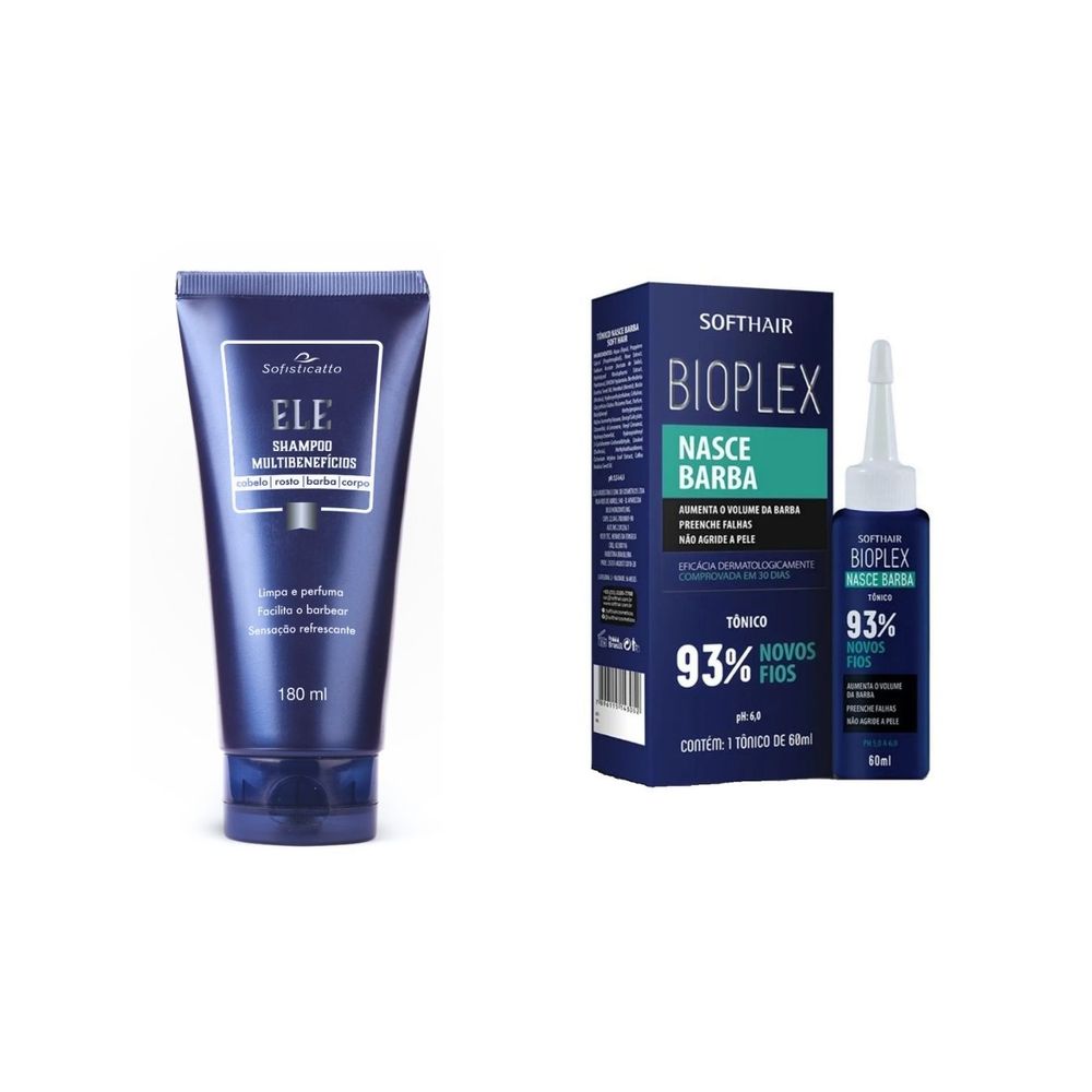 Kit para Barba Completo: Crescimento, Higiene e Cuidado em Um Só LugarVocê está buscando um kit para barba que ofereça crescimento acelerado e uma rotina prática de cuidados? Esse Kit Completo para Barba é a solução perfeita para homens que desejam uma barba mais cheia, saudável e bem cuidada, sem complicações!Como Usar:Shampoo Multibenefícios Ele Sofisticatto 180ml:  Aplique uma pequena quantidade do shampoo nas mãos e espalhe por todo o corpo, cabelo e barba, massageando suavemente até formar espuma. Enxágue bem. Pode ser usado diariamente para garantir uma pele e cabelos sempre limpos e saudáveis.Tônico para Crescimento de Barba Bioplex Soft Hair 60ml: Após a higienização da barba, aplique o tônico Nasce Barba em toda a região, realizando massagens circulares. Agite antes de usar. O produto pode ser usado entre 2 e 3 vezes ao dia. Mais informações de cada produto:Tônico para Crescimento de Barba Bioplex Soft Hair 60mlO Sistema de Tratamento BIOPLEX Nasce Barba para quem sofre de falhas e dificuldade de preenchimento integral da barba. O tônico Nasce Barba age diretamente na raiz do pelo, acelerando o desenvolvimento do bulbo, mantendo a hidratação e saúde da região aplicada com sensação refrescante.O Tônico BIOPLEX Nasce Barba não possui efeito vasodilatador e não agride a pele.Os produtos do Sistema de Tratamento Bioplex passaram por rigorosos testes de avaliação de eficácia e qualidade em laboratório da ANVISA e, os resultados obtidos garantem a qualidade e segurança durante todo o processo de uso. Resultados apresentados a partir de 30 dias de uso:Nascimento/ Crescimento de Novos pelos: 93% Crescimento de fios novos em toda a extensão da Barba: 73%Preenchimento da falha da barba: 86%Aumento do volume da barba: 93%Barba mais macia e sedosa: 73%Aspecto saudável da barba: 93%Fios mais fortes e grossos: 60%Sem irritação, sem ressecamento e sem agressão a pele: 100%ANVISA Processo: 25351.402057/2018-28 AFE 2.01236.1------------------------------------------Shampoo Masculino Multibenefícios Ele Sofisticatto 180mlProcurando praticidade e eficiência na sua rotina de cuidados pessoais? O Shampoo Masculino Multibenefícios Ele Sofisticatto é o produto ideal para homens que valorizam a simplicidade com resultados surpreendentes. Com uma fórmula inovadora, este shampoo é desenvolvido especialmente para o cuidado completo do cabelo, barba, rosto e corpo.Chega de complicação é hora de simplificar, pois esse produto foi pensado para ser um cuidado completo: Benefícios do Shampoo Masculino Multibenefícios:Cabelo: Para a parte capilar, promove limpeza e maciez, além de frescor para o couro cabeludo. Seu cabelo ficará limpo, macio e cheiroso por mais tempo.Pele: O Segundo benefício é a limpeza das impurezas da pele do corpo e do rosto, deixando-a limpa e cheirosa durante o dia.Barba: O terceiro benefício é focado na barba. Para quem gosta de manter a barba, promove limpeza e maciez aos fios. Para quem prefere retirar, proporciona um barbear suave debaixo do chuveiro.ANVISA PROCESSO 25351.274990/2024-47 AFE: 2.03567.6-------------------------Principais Tags de Pesquisa:bioplex nasce barba, cresce barba, produto para crescer barba, produto para crescer a barba, crescimento de barba, creme para crescer barba, crescimento de barba, melhor produto para crescer barba, barba crescer, produto para barba crescer, crescer barba rapido, qual o melhor produto para crescer barba, fazer a barba crescer, produto para crescer barba falhada, bioplex nasce barba antes e depois, tônico para barba, bálsamo para crescimento da barba, loção para estimular crescimento da barba, produtos para cuidados com a barba e crescimento, shampoo masculino multibenefícios, shampoo para barba, shampoo para cabelo e corpo, produtos masculinos de higiene, cuidado completo masculino, melhor shampoo masculino, shampoo masculino melhores, shampoo 3 em 1 masculino