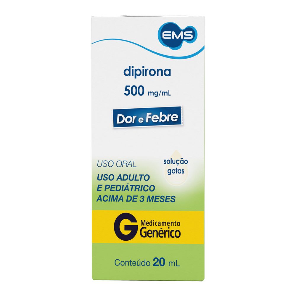 A Dipirona Sódica 500mg/ml Genérico EMS Gotas é indicada para o tratamento de quadros com febre e dor. O medicamento apresenta efeito em até 60 minutos e se mantém no organismo por até 4 horas. É contraindicada para menores de 3 meses de idade ou com peso menor de 5kg. A embalagem tem 20ml.