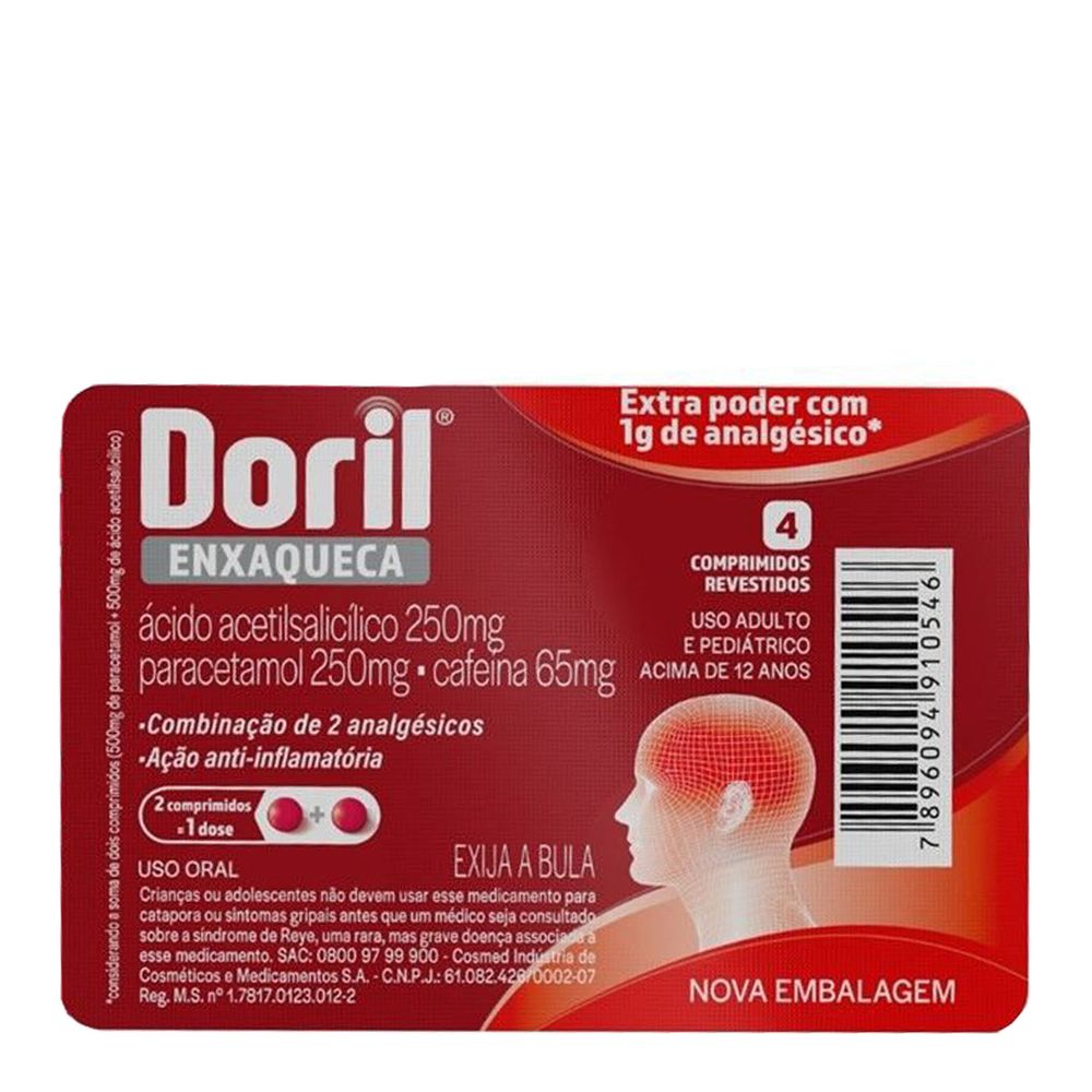 O Doril Enxaqueca com 4 comprimidos é indicado para aliviar dores em geral, de nível leve a moderada, principalmente enxaqueca. Alivia também dores originadas por resfriados ou sinusite, artrite, dores musculares, dor de dente e cólica pré-menstrual e menstrual.