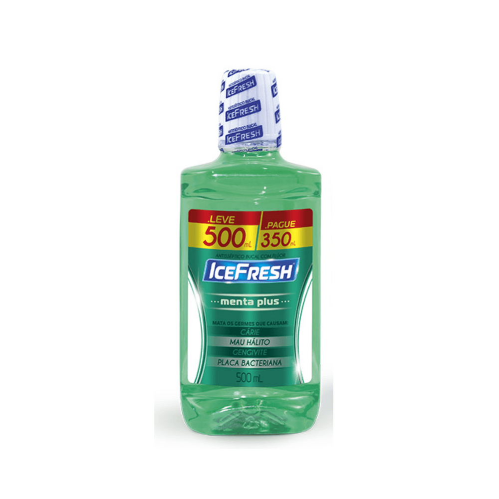 Enxaguante Bucal Ice Fresh Menta Sem Álcool 500mLMantenha seu hálito fresco e a boca saudável com o Enxaguante Bucal Ice Fresh Menta sem álcool! Com 500mL, este enxaguante é ideal para quem busca uma sensação refrescante sem agredir a mucosa bucal. Por que escolher o Enxaguante Bucal Ice Fresh Menta?Fórmula sem álcool: Cuida da sua boca sem causar ardência, ideal para o uso diário.Sabor menta refrescante: Proporciona uma sensação prolongada de frescor, combatendo o mau hálito.Ação eficaz: Auxilia na eliminação de bactérias causadoras de placas e odores.Volume econômico: 500mL para durar por muito mais tempo.Indicação de usoPerfeito para quem deseja manter a higiene bucal completa, complementando a escovação e o uso do fio dental, garantindo frescor e proteção contra bactérias. Como usarApós escovar os dentes, coloque aproximadamente 20mL do enxaguante na boca.Faça bochechos por 30 segundos.Cuspa o produto, sem necessidade de enxaguar com água.Dica: Use duas vezes ao dia para melhores resultados. Garanta já o seu Enxaguante Bucal Ice Fresh Menta sem álcool 500mL e sinta a diferença de um hálito sempre fresco e uma boca saudável!