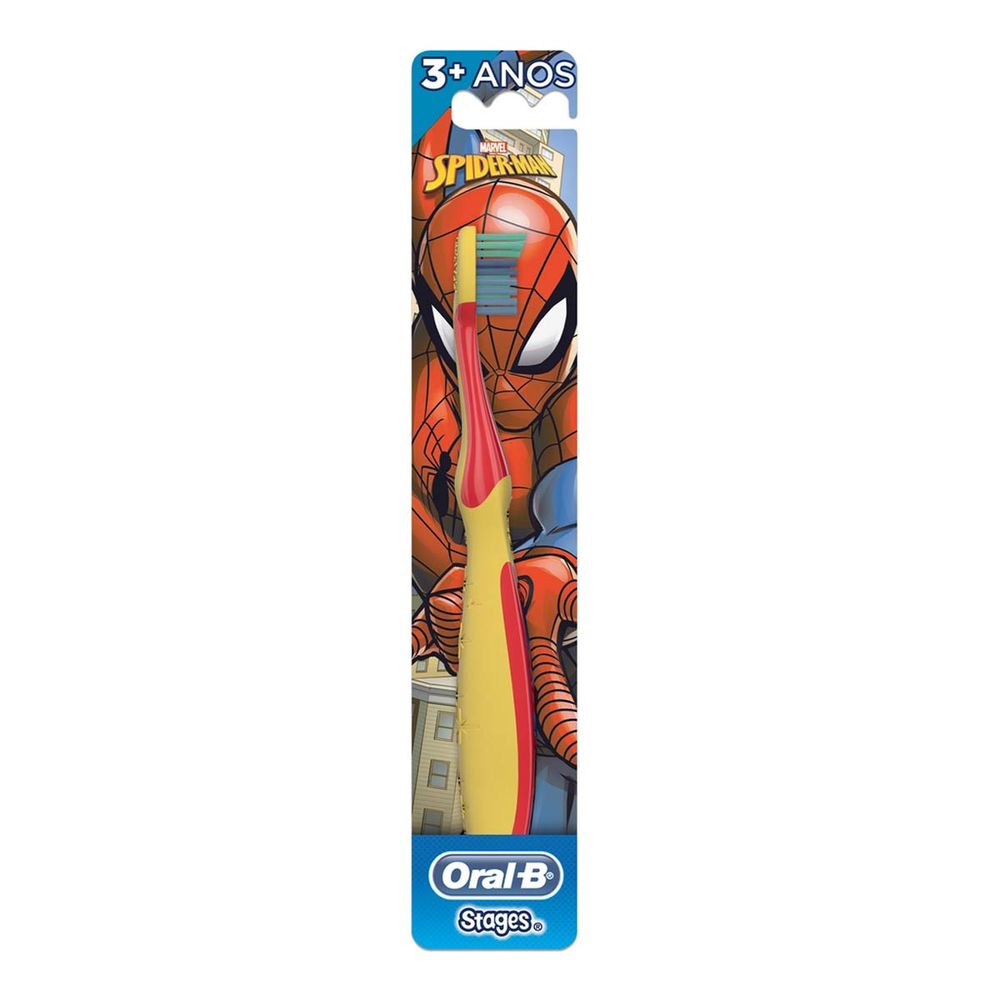 Escova Dental Oral B Stages Homem Aranha foi desenvolvida especialmente para crianças de 3 anos ou mais. Projetada com cerdas super macias para não machucar a gengiva e um limpador de língua, oferece uma higienização bucal eficaz e completa. Embalagem com 1 unidade.