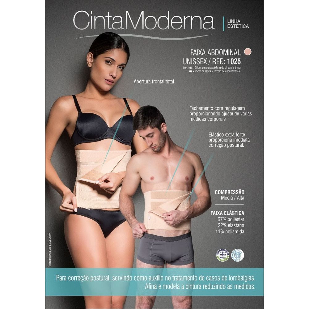 Faixa Abdominal com Velcro Moderna (1025). Confeccionado em microfibra de tecido rígido, elástico e que modela. Propícia para correção da postura. Diminui medidas e modela a silhueta. Faixa ajustável com fecho em velcro com ampla regulagem que proporciona ajuste perfeito à todos os tipos de corpo. Composição: 67% Poliéster, 22% Elastano e 11% Poliamida. Tamanho 01 (PQ/MD) Altura: 25 cm Comprimento: 98 cm Tamanho 02 (GD/EG) Altura: 25 cm Comprimento: 112 cmTabela de Medidas: | Tamanho | Busto Copa (B)| Tórax | Cintura | Quadril | |------------|-----------|-----------|-----------| | 36 (PP) | 76-79 | 60-63 | 60-63 | 86-89 | | 38 (PP) | 80-83 | 64-66 | 64-67 | 90-93 | | 40 (PP) | 84-87 | 66-69 | 68-71 | 94-97 | | 42 (PQ) | 88-91 | 70-74 | 72-75 | 98-101 | | 44 (MD) | 92-95 | 75-79 | 76-79 | 102-105 | | 46 (MD) | 96-99 | 80-84 | 80-83 | 106-109 | | 48 (GD) | 100-103 | 85-89 | 84-87 | 110-114 | | 50 (EG) | 104-109 | 90-94 | 88-91 | 115-120 | | 52 (EG) | 110-115 | 95-99 | 92-95 | 121-127 | | 54 (SG) | 116-122 | 100-104 | 96-106 | 128-133 | | 56 (XSG) | 123-129 | 105-109 | 107-117 | 134-139 | | 58 (XXSG) | 130-136 | 110-114 | 118-128 | 140-145 |;