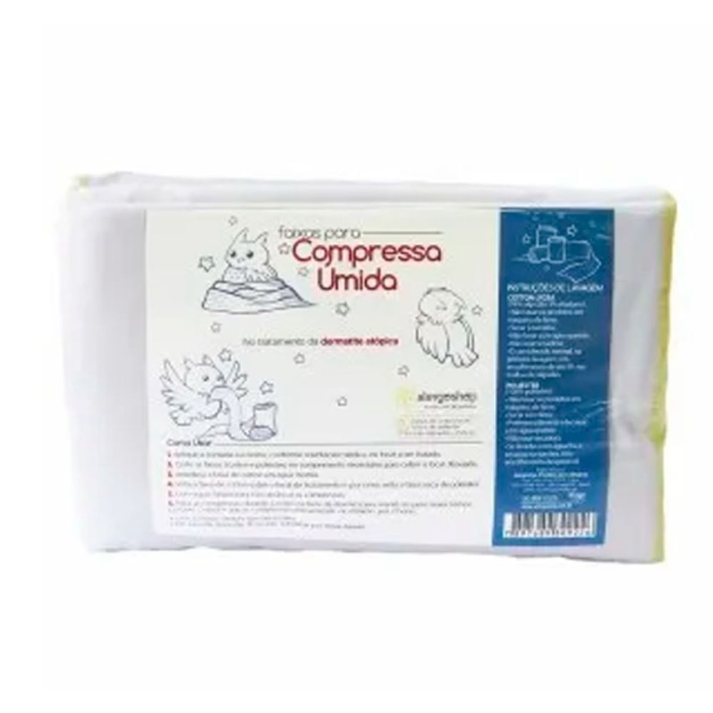 1. Aplique a pomada ou creme, conforme orientação médica, no local a ser tratado.2. Corte as faixas (cotton e suplex) no comprimento necessário para cobrir o local desejado.3. Umedeça a faixa de cotton em água morna.4. Vista a faixa de cotton sobre o local do tratamento e por cima, vista a faixa seca de suplex.5. Use roupas largas para não deslocar as compressas.6. Faça as compressas durante à noite (na hora de dormir) para mantê-las pelo maior tempo possível. O ideal é que as compressas permaneçam, no mínimo, por 2 horas.? Lave as faixas sempre que necessário.? Em caso de desgaste do tecido, substituir por novas faixas.Recomendações: