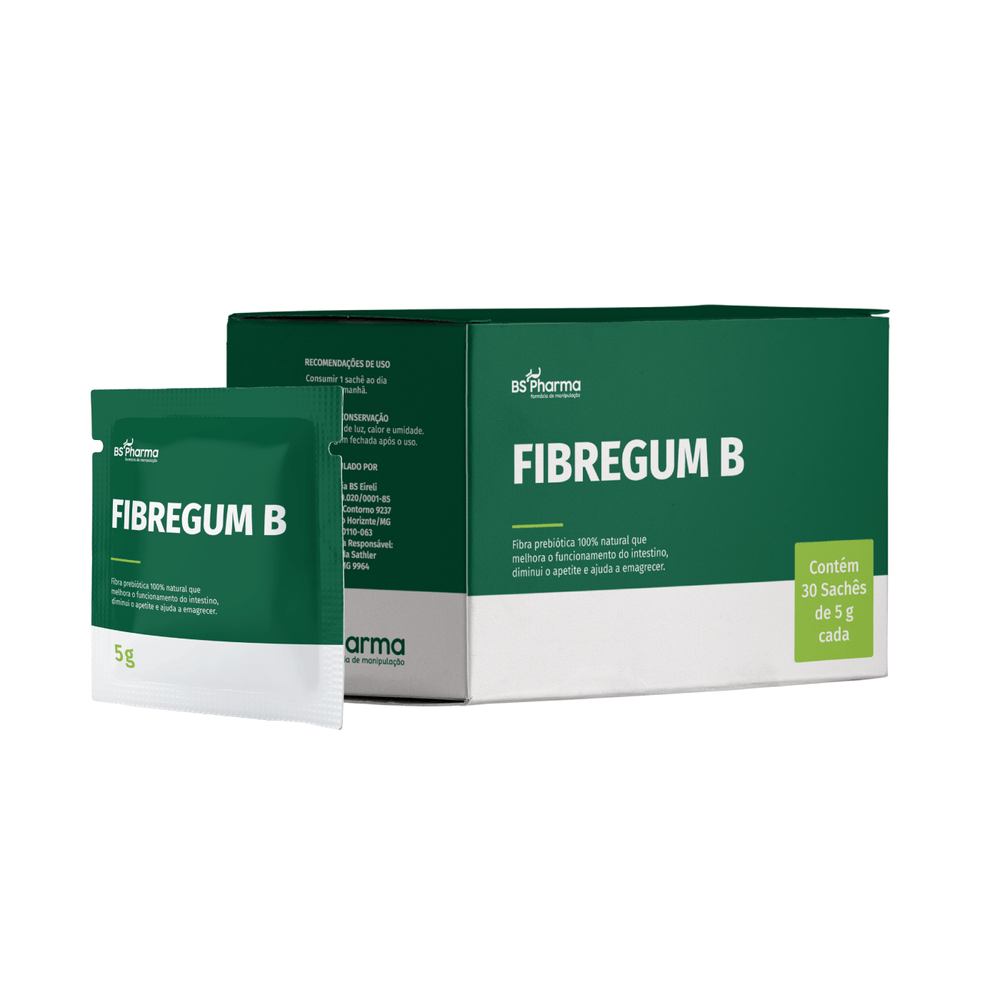 O que é Fibregum BFibregum é uma fibra natural derivada da Goma acácia purificada. A Goma acácia é uma fibra extraída de maneira sustentável do caule e dos ramos de uma árvore chamada Acacia senegal, encontrada comumente na África.Fibregum é uma fibra prebiótica bifidogênica, ou seja, serve de alimento para o crescimento de bactérias benéficas para o organismo, especialmente as bifidobactérias.Para que serve o Fibregum BFibregum B ajuda a proteger e manter a saúde e o bom funcionamento do intestino, além de melhorar a digestão. As fibras de Fibregum proporcionam um melhor equilíbrio da microbiota intestinal, o que aumenta a capacidade do sistema imune e melhora as defesas do organismo.Benefícios do Fibregum B Fibregum é 100% natural, extraído de forma sustentável, minimamente processada, e sem modificações químicas ou enzimáticas. Sua eficácia no aumento do número de bactérias intestinais benéficas foi comprovada por um estudo realizado pela Nexira, que demonstrou um aumento significativo da população da flora intestinal, principalmente em indivíduos com números baixos de bifidobactérias.Como Fibregum B te ajuda no controle do pesoFibregum é um alimento para as bactérias boas que habitam no organismo, e quando essas bactérias se alimentam do Fibregum, liberam importantes neuropeptídeos intestinais como resultado da metabolização das fibras. Esses neuropeptídeos são substâncias responsáveis por mandar para o cérebro a informação de saciedade. Fibregum ajuda a diminuir a ingestão de alimentos pois diminui a fome e aumenta a sensação de saciedade, sendo muito indicado pra ajudar no controle do apetite.Fica mais fácil controlar o peso e potencializar seu emagrecimento cuidando do seu intestino com Fibregum B. Uma digestão mais saudável, uma flora intestinal equilibrada, o aumento da sensação de saciedade e o fortalecimento do sistema imune são só algumas das vantagens de consumir Fibregum.Fibregum é de fácil consumo. Por ser em pó, pode ser misturado com qualquer alimento; iogurtes, sucos, água, pode ser consumido com frutas, shakes. Do jeito que você preferir.Vantagens de Fibregum B para você: - É 100% natural; - Livre de organismos geneticamente modificados; - Auxilia no controle dos níveis de glicose; - Melhora a digestão e as funções intestinais, sendo indicado para o cuidado da constipação; - Não causa irritação e formação de gases, como acontece com outras fibras prebióticas; - Equilibra a flora intestinal e fortalece o sistema imunológico; - Aumenta a sensação de saciedade e ajuda no controle do apetite; - É um grande aliado no emagrecimento e no gerenciamento de peso.Apresentação: Sachês de alumínio.;Composição: Fibregum 5g; excipiente qsp 1 sachê. NÃO CONTÉM GLÚTEN. SABOR E ODOR CARACTERÍSTICOS, NÃO CONTÉM ADOÇANTES.;Imagem: Seu intestino de bem com você. Você de bem com a balança 100% natural, é versátil, cuida da saúde do intestino e ajuda a controlar o peso corporal. Tudo isso em um sachê com a dose certa de fibregum para você. Aproveite. ;Recomendações de uso: Consumir 1 sachê ao dia pela manhã.;Validade: 06 meses após data de manipulação.;Armazenamento: Armazenar protegido de luz, calor e umidade. Manter a embalagem fechada após o uso.;Embalagem: Caixa com 30 sachês lacrados.;Requisitos de Segurança: Grávidas, lactantes, crianças e portadores de alguma enfermidade devem sempre ser orientados pelos seus prescritores antes de fazer uso de qualquer substância. Imagens meramente ilustrativas.;