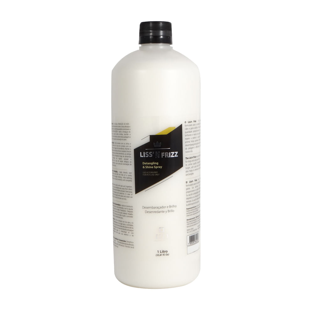 Fluído Desembaraçador Liss`N Frizz Ezze é especialmente formulado para o cuidado dos pelos de cães e gatos adultos.Seus ativos de alta qualidade proporcionam uma pelagem brilhante e macia.Sua ação anti estática repele a poeira e sujeira, deixando o animal limpo por mais tempo.Sua ação desembaraçante auxilia na retirada de nós da pelagem e dificulta a formação de novos.Composição:Dimethiconol (and) Tea -Dodecylbenzenesulfonate, Amodimethicone (and) Cetrimonium Chloride (and) rideceth-12, Veículo q.s.p.Modo de usoUso tópico.Remoção de nós- Aplicar o produto diretamente sobre a área afetada e com a ajuda de um pente/rasqueadeira promover a retirada do nó.Finalização- Após o enxague do animal, com os pelos ainda úmidos, borrifar o produto a 15 cm de distancia, sobre toda a pelagem e proceder com a secagem e escovação do pelo.Idade: Adulto;Linha: Desembaraçador;Linha: Pós banho;Linha: Spray;Fragrância: Agradável;Indicação: Cachorros e Gatos;