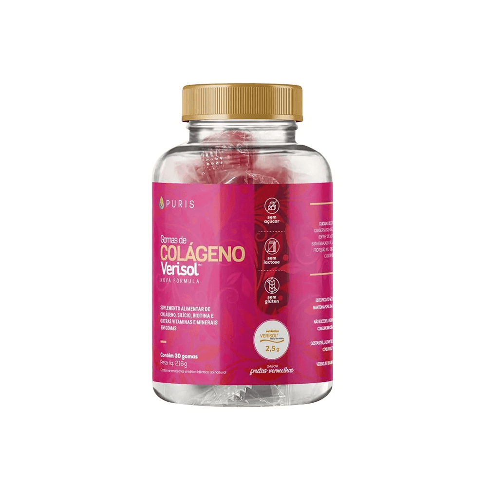 O que são as Gomas de Colágeno Verisol da PurisSão gomas sabor frutas vermelhas, compostas por colágeno verisol, vitaminas e minerais de alta biodisponibilidade. Essa associação de ativos potencializa os efeitos do colágeno e ajuda na hidratação, firmeza e saúde da pele, cabelos e unhas.Praticidade, sabor e cuidadoOs peptídeos bioativos de colágeno alcançam as células mais profundas da pele, promovendo uma intensa hidratação e aumentando a firmeza das fibras, ajudando a aliviar as linhas de expressão e retardando o aparecimento de rugas.As Gomas de Colágeno Verisol são uma ótima alternativa para cuidar da saúde da pele, dos cabelos e das unhas. São práticas de carregar, embaladas individualmente e podem ser consumidas em qualquer hora e lugar.Benefícios do Colágeno VerisolO colágeno é um importante suplemento alimentar, com alta poder de hidratação e capacidade de aumentar a elasticidade da pele, fortalecer as unhas e os cabelos. É uma proteína que atua diretamente na formação das fibras responsáveis por sustentar a pele e as articulações, por isso, contribui também para a saúde articular.O colágeno também auxilia na manutenção da boa forma, pois ajuda a aumentar a saciedade e controlar o apetite, além de favorecer o aumento de massa muscular.O que as Gomas de Colágeno Verisol te oferecem - Ajuda na reposição de colágeno; - Estimula o crescimento dos cabelos e unhas; - Ameniza rugas e linhas de expressão; - A vitamina A auxilia no funcionamento do sistema imunológico e manutenção da pele; - A vitamina B1 auxilia no metabolismo energético, de proteínas, carboidratos e gorduras; - A biotina contribui para a manutenção da saúde do cabelo e da pele; - O ácido pantotênico auxilia no metabolismo energético; - A vitamina B6 auxilia na síntese de cisteína e metabolismo de carboidratos; - A vitamina C auxilia na absorção de ferro, é antioxidante, ajuda na manutenção do sistema imune e na formação de colágeno; - A niacina contribui para a manutenção da pele, mucosas, no metabolismo energético, de proteínas, carboidratos e gorduras; - A vitamina E e o selênio são antioxidantes que auxiliam na proteção dos danos causados pelos radicais livres; - O magnésio auxilia no processo de divisão celular; - O zinco auxilia para a manutenção do cabelo, pele e unhas, no processo de divisão celular, na síntese de proteínas, no funcionamento do sistema imune, no metabolismo da vitamina A, e combate os danos causados pelos radicais livres.Apresentação: Gomas com pectina sabor frutas vermelhas;Recomendações de uso: Produto indicado para adultos maiores de 19 anos. Consumir 1 goma diariamente ou conforme orientação do médico ou nutricionista. Após aberto, consumir em até 30 anos.;Composição: Peptídeos bioativos de colágeno hidrolisado, com peso molecular médio de 2Kda - Verisol®, água, ácido ascórbico (vitamina c), acetato de d-alfa-tocoferol (vitamina e), bisglicinato de zinco (zinco), d-pantetonato de cálcio (ácido pantotenóico), cloridrato de piridoxina (vitamina b6), ácido ortosilício estabilizado em cloreto de colina (silício), d-biotina (biotina), selenito de sódio (selênio). Agente de massa: xarope de maltilol. Acidulante: Ácido cítrico, gelificante: pectina. Edulcorantes: xilitol, glicosídeos de esteviol. Aroma idêntico ao natural de frutas vermelhas. Corante natural de carmin. NÃO CONTÉM LACTOSE. NÃO CONTÉM GLÚTEN.;Validade: 12 meses após fabricação.;Conteudo da embalagem: Conservar ao abrigo da luz, calor (entre 15°C e 25°C) e umidade. Este embalagem foi lacrada para sua proteção. Não utilize o produto em caso de violação.;Embalagem: Frasco com 30 gomas e lacre de proteção.;Requisitos de segurança: Este produto não é medicamento. Mantenha fora do alcance de crianças. Não exceder recomendação diária de consumo indicada na embalagem. Gestante, lactantes e crianças não devem consumir este produto. Verisol® é uma marca Gelita, AG.;