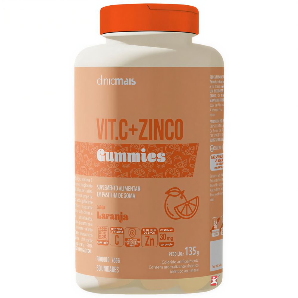 GUMMIES DE VITAMINA C + ZINCO SABOR LARANJA 30 GOMAS - CLINICMAIS DESCRIÇÃOO VIT. C + ZINCO Gummies da ClinicMais é um suplemento alimentar em pastilhas de goma, desenvolvido para fortalecer o sistema imunológico de forma prática e saborosa. Com alto teor de vitamina C e zinco, oferece suporte à defesa natural do organismo e ajuda na proteção contra os danos causados pelos radicais livres.Com sabor natural de laranja e textura macia, é ideal para quem busca uma rotina saudável sem abrir mão do prazer. BENEFÍCIOS- Auxilia no funcionamento do sistema imunológico;- Ação antioxidante contra os radicais livres;- Contribui para a formação do colágeno e manutenção da pele;- Suporte ao metabolismo e à energia diária;- Fórmula prática e sabor agradável de laranja;- Suplemento em goma – fácil de consumir e sem necessidade de água;- Não contém glúten. INGREDIENTES E COMPOSIÇÃOÁgua, vitamina C (ácido ascórbico), zinco (bisglicinato de zinco), triglicerídeos de cadeia média, agentes de massa (xaropes de maltitol e sorbitol), gelificante (gelatina e pectina), umectante eritritol, acidulante (ácidos cítrico e lático), aromatizantes, antiumectante talco, glaceante cera de carnaúba, conservante sorbato de potássio, corantes (betacaroteno sintético e carmim), edulcorante sucralose e sequestrante EDTA dissódico.NÃO CONTÉM GLÚTEN. MODO DE CONSUMO E PÚBLICO INDICADO- Sugestão de consumo: ingerir 1 unidade ao dia.- Indicação: produto indicado para os grupos populacionais de 4 a 8 anos, 9 a 18 anos e maiores de 19 anos. RECOMENDAÇÕES E CUIDADOSESTE PRODUTO É UM SUPLEMENTO ALIMENTAR. NÃO EXCEDER A RECOMENDAÇÃO DIÁRIA DE CONSUMO INDICADA NA EMBALAGEM. MANTENHA FORA DO ALCANCE DE CRIANÇAS. ESTE PRODUTO NÃO É UM MEDICAMENTO. O CONSUMO EM EXCESSO PODE TER EFEITO LAXATIVO. A VITAMINA C E O ZINCO AUXILIAM NO FUNCIONAMENTO DO SISTEMA IMUNE.