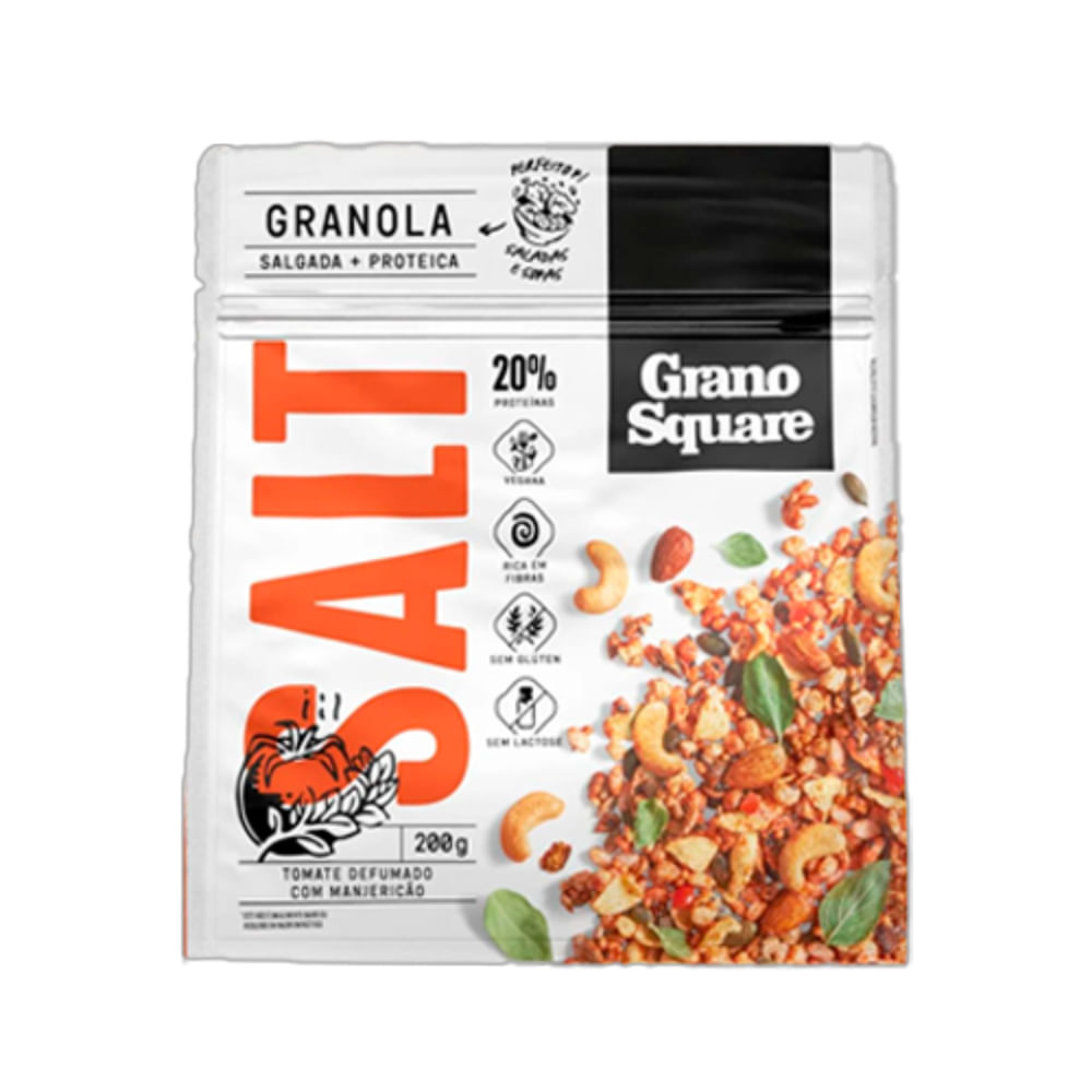 A Granola Salt Tomate com Manjericão GranoSquare é a escolha perfeita para adicionar um toque saudável e delicioso a saladas, sopas e cremes.  A Granola Salt Tomate com Manjericão GranoSquare é rica em proteínas veganas e fibras, contribuindo para refeições equilibradas que proporcionam saciedade prolongada. Uma escolha inteligente para quem busca sabor e bem-estar em cada refeição. Ingredientes: Mix de sementes (girassol, abóbora, linhaça e gergelim preto), mix de cereais (flocos de arroz e milho), fibra de tapioca, mix de flocos proteicos (proteína texturizada de ervilha e crispies de quinoa), mix de nuts (castanha de caju e amêndoa), tomate desidratado, óleo de coco virgem, manjericão liofilizado, sementes de urucum em pó, sal marinho, extrato de levedura, extrato de alecrim e aromas naturais. NÃO CONTÉM GLÚTEN.CONTÉM CASTANHA DE CAJU E AMÊNDOA. PODE CONTER CASTANHA DO PARÁ, NOZES E AMENDOIM.  Sobre a marca: GranoSquare foi criada com muito amor e carinho desde o início.Uma receita única, desenvolvida dentro da nossa casa para agradar à um marido devorador de granolas!O resultado foi tão surpreendente e delicioso que logo caiu no gosto de toda família e dos amigos e hoje, 9 anos depois, no de milhares de brasileiros que a devoram diariamente.Nos demos conta de que mudamos o mercado nacional de granolas. Nos tornamos referência e conseguimos inspirar até grandes marcas que já existem há muito tempo.Isso é incrível e nos deixa muito realizados!Temos paixão por GRANOLA por ser um alimento nutritivo, saudável, versátil, prático, que a gente torna extremamente saboroso e faz todo mundo querer comer todos dias em diversos momentos!Da nossa casa, para sua casa e para o mundo! Essa é nossa história, esse é o nosso sonho! Sobre a Boomi: A Boomi é  um mercado online com produtos saudáveis e sustentáveis, que fazem bem à saúde e ao planeta. São mais de 3.500 produtos de 150 pequenas marcas para você!Nascemos pequenos, mas com um propósito gigante: conectar pessoas a produtos acessíveis que tragam benefícios para a saúde, para o planeta e para a sociedade. Para isso, buscamos ofertar produtos de pequenos agricultores e pequenas empresas em um mundo cada vez mais veloz e que busca mais produtividade. Vamos sempre buscar levar o melhor para você!Nosso propósito é conectar alimentos saudáveis e produtos naturais e sustentáveis a pessoas preocupadas com a sua saúde e com a saúde do planeta. Com preço justo, comodidade e informações confiáveis.Curadoria: Nossos produtos são criteriosamente validados pela nossa curadoria de produtos saudáveis, que busca produtores e empresas que compartilham do nosso alto padrão de qualidade. Da enorme lista de ingredientes banidos à preocupação do bem estar animal, desde o primeiro dia seguimos fieis aos nossos valores, trabalhando com transparência e práticas sustentáveis. Vendemos apenas produtos que admiramos e que nos orgulha.