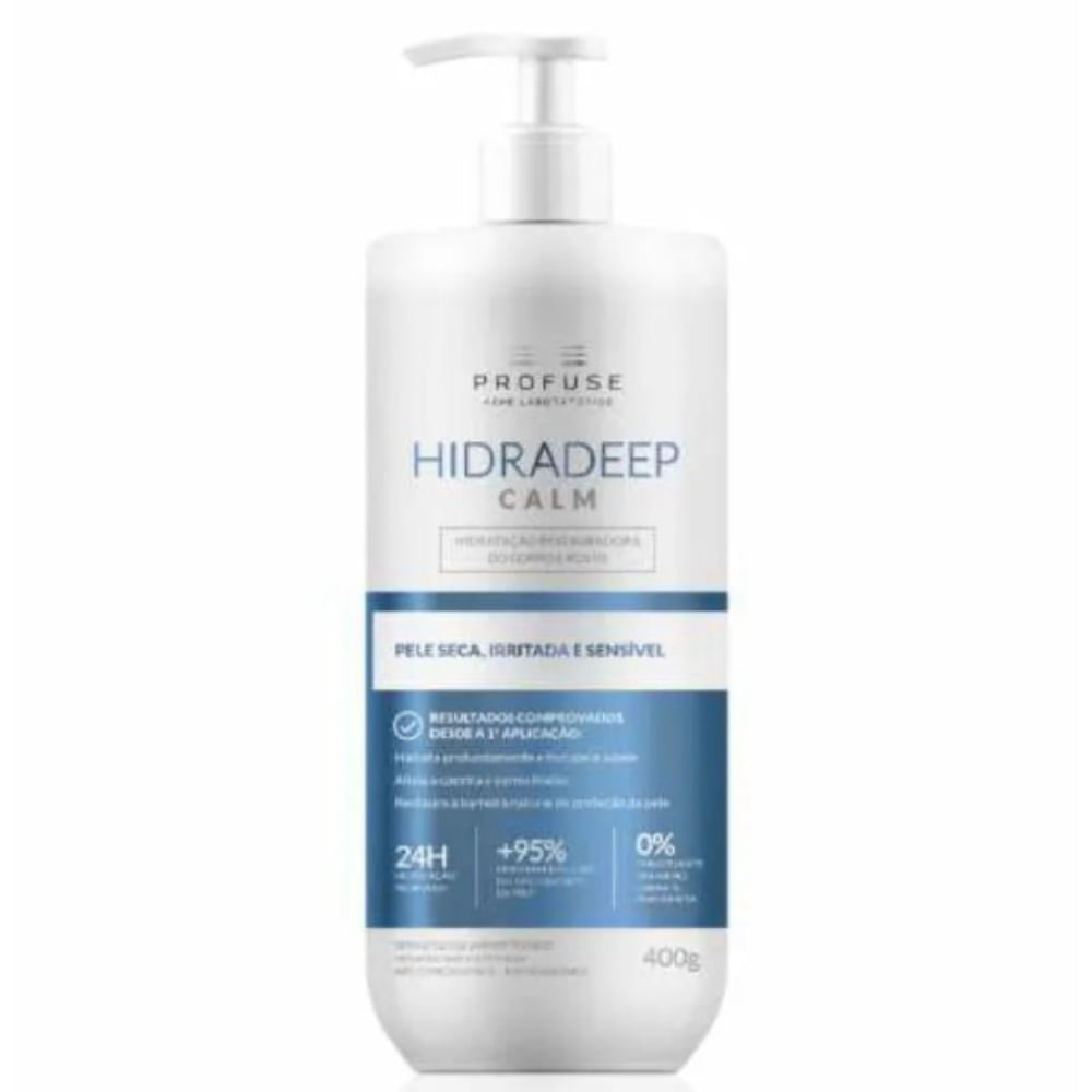 Hidratante para corpo e rosto PROFUSE HIDRADEEP CALM pele seca e sensível 400G Mais que um hidratante, HIDRADEEP CALM faz parte da rotina de peles que sofrem com irritação, coceira, vermelhidão, sensibilidade e ressecamento da pele. Seu rico complexo hidratante associado a ação restauradora e calmante da Niacinamida e ao Pantenol, consagrado por sua ação reepitelizante, ajudam a acelerar a recuperação e o fortalecimento da barreira de proteção da pele, além de oferecer ação calmante com conforto imediato, melhora da irritação, coceira, vermelhidão e ressecamento da pele, e ainda prolonga a hidratação por 24 horas.