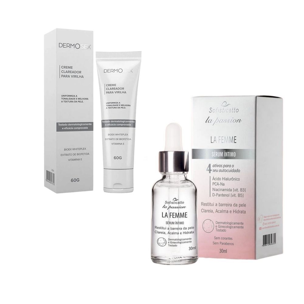 Kit Contendo:1- Sérum Para Região Íntima La Femme Sofisticatto 30ml1- Clareador de Virilha Dermosex 60gDesperte a autoconfiança com o kit de cuidados para região íntima Dermosex e Sofisticatto. Kit exclusivo contendo produtos com ingredientes premium, este kit revolucionário oferece uma solução suave e eficaz para restaurar e uniformizar a tonalidade da sua região mais sensível.Observarção: O Sérum La Femme poderá ser utilizado em toda a parte Externa da região íntima (vulva) enquanto o Clareador de Virilha Dermosex deve ser utilizado apenas na parte de pele seca íntima (virilha, extre coxas e etc) evitando áreas de mucosa .Veja a seguir as informações de cada produto individualmente:----------------------------------Sérum Para Região Íntima La Femme Sofisticatto 30mlO segredo foi revelado para um cuidado íntimo excepcional: O Sérum Íntimo La Femme Sofisticatto foi desenvolvido para proporcionar uma experiência única de bem-estar, este produto vai além da hidratação, oferecendo um cuidado delicado e eficaz para a sua região íntima externa.A estética íntima é a nova tendência do mercado e cada vez mais vem alcançando tanto o público feminino quanto o masculino. La Femme Sérum Íntimo é um produto com 4 com ativos poderosos que trabalham em sinergia com características umectantes, hidratantes, calmantes e clareadoras que atuam restituindo a barreira da pele, reduzindo a vermelhidão na região íntima após atritos de qualquer natureza.Além disso, oferece fórmula suave ginecologicamente e dermatologicamente testada sem presença de corantes e parabenos ou agentes agressivos.Benefícios de 4 ativos para o seu autocuidado íntimo:Fórmula Avançada com Ácido Hialurônico: A fórmula do Sérum Íntimo La Femme é enriquecida com o poder do ácido hialurônico, conhecido por suas propriedades hidratantes profundas que recuperam a elasticidade da pele diminuindo a flacidez, os aspectos envelhecidos, mantém a pele mais jovem e mais saudável.Ação Clareadora da Niacinamida (Vita B3): Vitamina do complexo B famosa por combater a hiperpigmentação, oferece uniformização do tom da pele, contribui para a redução da aparência de manchas escuras e vermelhidão normalmente causadas por atritos. Proporciona luminosidade e revitalização.Hidratação Hintensa com D Pantenol (Vita B5): A Pró Vitamina B5 produzida pelo nosso próprio organismo, é uma vitamina poderosa contra o ressecamento, pois além de repor a água perdida ela controla a perda da umidade da região.Suavidade e Maciez com PCA-NA: Ativo com poderosa ação umectante, assim como o D Pantenol, ajuda a reter a hidratação, promove maciez e toque sedoso para pele.ATENÇÃO: Produto destinado apenas a parte EXTERNA da região íntima. ANVISAProcesso: 25351.630692/2023-61 Aut Func. MS: 2.03567.6Modo de usar: Com as mãos limpas aplique de 3 a 4 gotas nas partes íntimas externas. Espalhe com movimentos circulares até completa absorção.-------------------------------------------------------------Creme Clareador de Virilha DermosexCreme Clareador Intimo para Virilha é para uso tanto masculino quanto feminino. Creme para aplicação corporal que clareia e uniformiza o tom da pele, principalmente na área das virilha.Previne rugas, melhora a cicatrização, aumenta a firmeza da pele, já que participa da formação do colágeno. Além disso, age como hidratante potente para a pele.Para quais tipos de pele: Todos os tipos de pelePrincipais benefícios:Ação calmanteClareia e uniformiza o tom de pelePode ser usado no verãoObs: Utilizar apenas o creme em áreas de pele seca evitando região de mucosa!REGISTRO ANVISA: AFE 2.03.200-7 N° Processo 25351.036147/2020-31----------------------------------Tagsde Pesquisa:tratamento para flacidez íntima, tratamento para flacidez dos grandes lábios, hidratante intimo, melhor hidratante íntimo feminino, creme hidratante para partes íntimas, hidratante intimo feminino, gel hidratante íntimo externo, hidratante íntimo externo, gel íntimo hidratante, gel hidratante íntimo masculino, hidratante íntimo à base de água, gel hidratante externo preço, clareador intimo, creme clareador intimo, clareador de partes intimas, clareamento íntimo preço, clareador partes intimas, clareamento região íntima, creme clareador partes intimas, clareador para partes intimas, creme clareador de partes intimas, tratamento para clarear partes intimas, clareador virilha, clarear virilha, clareador de virilha, creme para clarear virilha, creme para clarear virilha, creme clareador de virilha