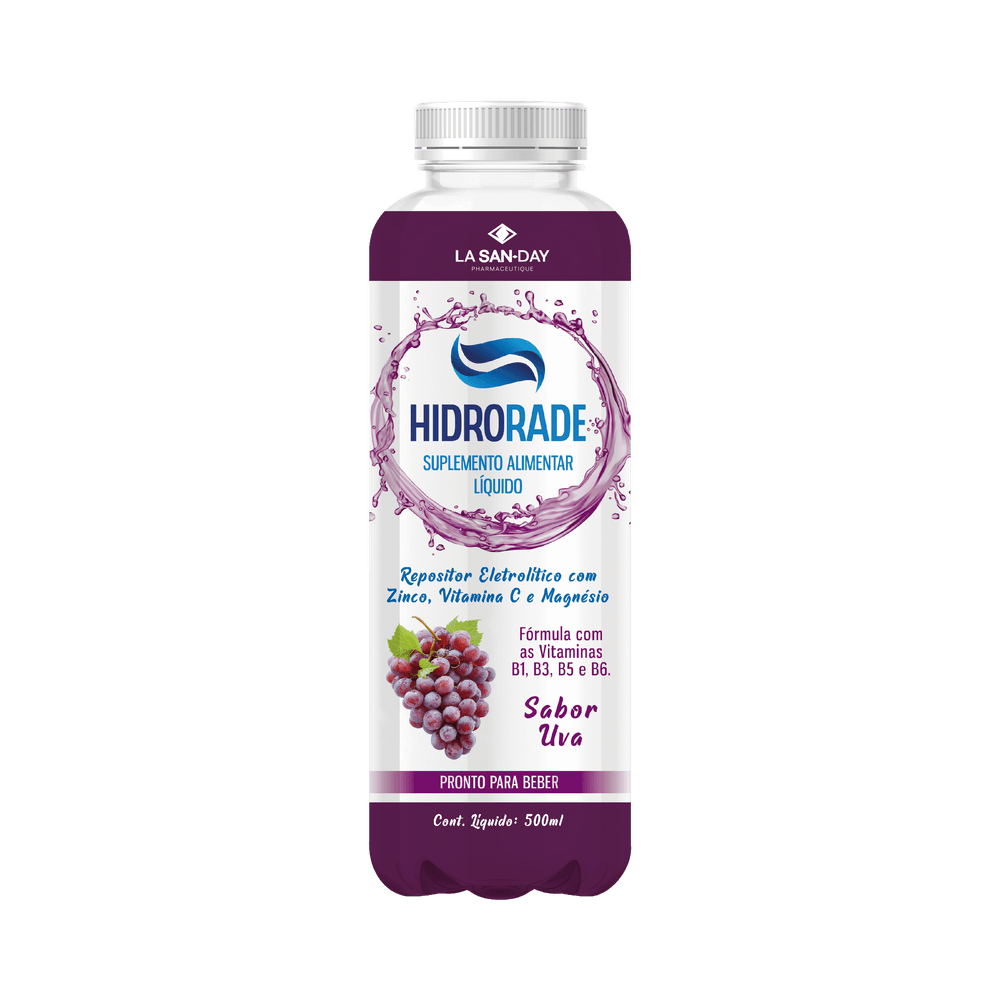 REPOSITOR ELETROLÍTICO COM ZINCO, COMPLEXO B, MAGNÉSIO E VITAMINA C. COMPOSIÇÃO: Água, Sacarose, Maltodextrina, Cloreto de Sódio, Citrato de Sódio, Fosfato de Potássio, Cloreto de Potássio, Ácido Ascórbico, Nitrato de Tiamina, Nicotinamida, D-Pantotenato de Cálcio, Cloridrato de Piridoxina, Sulfato de Zinco Heptahidratado, Cloreto de Magnésio Hexahidratado, Conservantes Benzoato de Sódio e Sorbato de Potássio, Acidulante Acido Cítrico, Aroma Idêntico ao Natural de Uva, Corantes Vermelho Ponceau e Azul Brilhante. APRESENTAÇÃO: Garrafa de 500ml sabor Uva. RECOMENDAÇÕES DE USO: Ingerir uma garrafa ao dia (500ml), seu consumo pode ser intercalado com outros líquidos, como água, sucos e sopas. Beber gelado. Já vem pronto para beber, não diluir. Agite antes de usar. ALÉRGICOS: COLORIDO ARTIFICIALMENTE. CONTÉM AÇÚCAR. NÃO CONTÉM GLÚTEN. PREUCAÇÕES: Não exceder a recomendação diária de consumo indicada na embalagem. Mantenha fora do alcançe de crianças. Este produto não deve ser consumido por gestantes, lactantes e crianças.