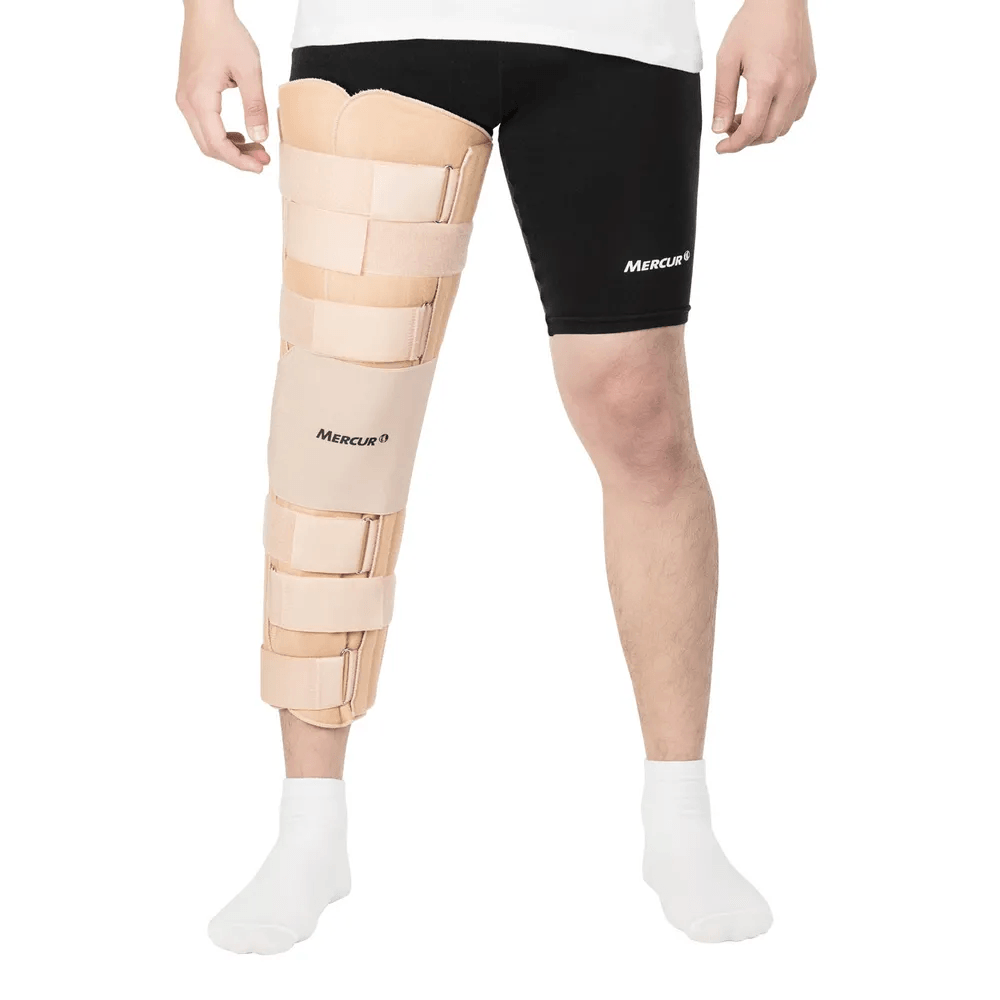 Indicado para imobilização do joelho em casos de traumas, lesões e pós-operatório. Pode substituir o gesso. Confeccionado em tecido acolchoado com espuma e forro em algodão. Possui três talas posteriores fixas em alumínio, modeladas de acordo com a curvatura do joelho, e talas laterais removíveis, que podem ser posicionadas de acordo com a circunferência da perna. Com sistema de fecho em tiras e cinta elástica, que proporcionam melhor ajuste e compressão. O Imobilizador facilita a higienização e permite a aplicação de correntes elétricas (eletroterapia) durante o período de recuperação. Para saber o TAMANHO adequado, meça a altura da perna, do quadril ao tornozelo: Tamanho P: 50 cm Tamanho M: 60 cm Tamanho G: 70 cm Para saber o MODELO adequado, meça a circunferência do início da coxa: Estreito: 59 cm Largo: 68 cm Cor: Bege COMPOSIÇÃO: Pluma:100% Poliamida Espuma: 100% Poliuretano Atoalhado: 80% Algodão e 20% Poliéster