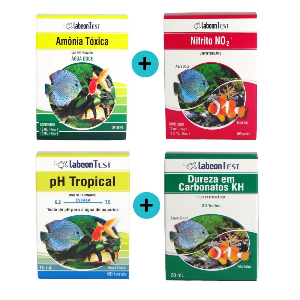 O kit Contém: 1 Labcon Amônia Tóxica Água Doce + 1 labcon Nitrito + 1 Labcon Dureza KH +1 Labcon PH Tropical 15ml- Alcon