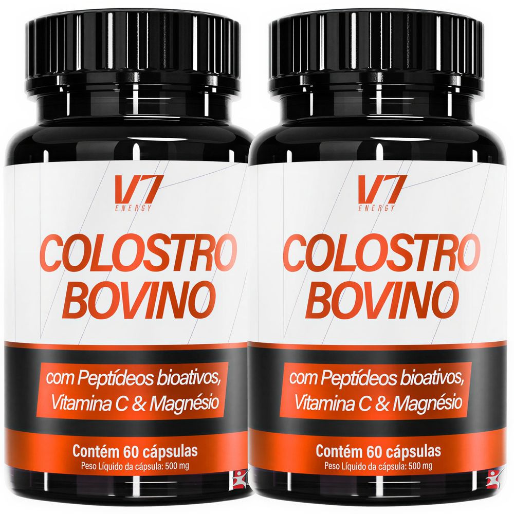 KIT COM: 2 COLOSTRO BOVINO + PEPTÍDEOS BIOATIVOS + VITAMINA C + MAGNÉSIO 60 CAPSULAS CADA FRASCO - V7 ENERGYTOTAL: 120 CÁPSULAS POR KIT. DESCRIÇÃOSuplemento alimentar de colostro bovino com Peptídeos bioativos, imunoglobulinas, Vitamina C e Magnésio.   O que é Colostro Bovino? O colostro bovino é o primeiro leite da vaca após o parto de um bezerro. É um líquido rico em nutrientes. O que são peptídeos bioativos? São pequenas moléculas de aminoácidos. O que são imunoglobulinas?Imunoglobulinas são tipos de anticorpos. O colostro bovino é naturalmente rico em imunoglobulinas, como IgG, IgM, IgA, IgD e IgE. IgG e IgM.Vitamina C (ácido ascórbico) - Antioxidante que auxilia na proteção dos danos causados pelos radicais livres, funcionamento do sistema imune, formação do colágeno, metabolismo energético e metabolismo de proteínas e gorduras.Magnésio - auxilia na formação de ossos e dentes, no metabolismo energético, no metabolismo de proteínas, carboidratos e gorduras, equilíbrio dos eletrólitos, funcionamento neuromuscular e processo de divisão celular. Recomendação de Uso: Consumir 2 cápsulas por dia. INGREDIENTES: Colostro bovino desnatado (peptídeos bioativos), bisglicinato de magnésio, amido de milho, ácido ascórbico (vitamina C), antiumectante Dióxido de silício (INS 551). Composição da cápsula: Gelatina e corante Dióxido de Titânio (171).NÃO CONTÉM GLÚTEN. TABELA NUTRICIONALAnexo nas imagens do anúncio. RECOMENDAÇÕES, CUIDADOS & CONSERVAÇÃO"RECOMENDAÇÃO DE USO PARA O GRUPO POPULACIONAL = 19 ANOS”;“ESTE PRODUTO NÃO É UM MEDICAMENTO”;“NÃO EXCEDER A RECOMENDAÇÃO DIÁRIA DE CONSUMO INDICADA NA EMBALAGEM”;“MANTENHA FORA DO ALCANCE DE CRIANÇAS.”“ESTE PRODUTO NÃO DEVE SER CONSUMIDO POR GESTANTES, LACTANTES E CRIANÇAS.”ADVERTÊNCIA ESPECIAL PARA ATLETAS:  “A Agência Mundial de Antidopagem (WADA - World Anti-Doping Agency) desaconselha o uso do colostro bovino por atletas, por conter quantidades naturalmente presentes de IGF-1 e de outros fatores de crescimento que podem influenciar o resultado de testes de anti-doping.”CONSERVAÇÃO: Manter o produto em lugar seco e arejado. Após aberta a embalagem, manter a tampa bem fechada para garantir as características do produto e recomenda-se o consumo em até 90 dias. REGISTRO ANVISADispensado de registro conforme RDC 240/2018 Anvisa.