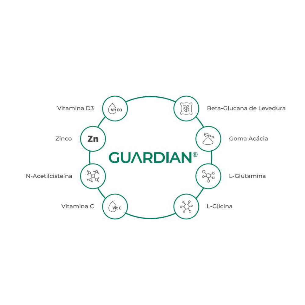 OS NUTRIENTES orientação de um médico ou nutricionista. QUE FORTALECEM O INTESTINO E A IMUNIDADE O intestino é composto por tecidos altamente proliferativos que demandam um suprimento contínuo de nutrientes, obtidos através da alimentação adequada ou suplementaçãoNutrientes para a integridade da barreira intestinal: Os aminoácidos glutamina, glicina e cisteína e a goma acácia são fundamentais para a manutenção da integridade da mucosa intestinal, criando uma barreira contra patógenos. Modulação da resposta imune para uma defesa eficiente: Estudos mostram que os ß-glucanos encontrados na levedura Saccharomyces cerevisiae, aliados ao zinco e às vitaminas C e D, são essenciais para modular a resposta imune. Eles ativam células defensivas, como macrófagos e dendríticas, elementos-chave para um sistema imunológico forte O efeito sinérgico dos nutrientes: Com uma formulação exclusiva, o GUARDIAN® contém aminoácidos como a L-Glicina, L-Glutamina e Cisteína, juntamente com Goma Acácia e Betaglucana de levedura Saccharomyces cerevisiae, reconhecidos por suas propriedades prebióticas. Enriquecido também com Ácido Ascórbico (Vitamina C), Zinco e Vitamina D3, nutrientes indispensáveis para manter o equilíbrio e promover o bem-estar do organismo. BENEFÍCIOS• Promoção da Saúde Intestinal.• Auxilia no funcionamento do intestino, promovendo melhoria na digestão, absorção de nutrientes e eliminação de toxinas.• Auxilia no funcionamento do sistema imune, estimulando a produção de células de defesa contra patógenos, ajudando assim, a fortalecer as barreiras naturais do corpo.• Fonte de fibras, auxilia na motilidade do intestino e equilíbrio da microbiota intestinal. Recomendação de uso e preparo: Adicione um sachê (8,5 g) em aproximadamente 200 ml (1 copo) de água e misture até a total homogeneização. Beba imediatamente após o preparo. Consumir 2 sachês ao dia ou conforme OS NUTRIENTES orientação de um médico ou nutricionista.