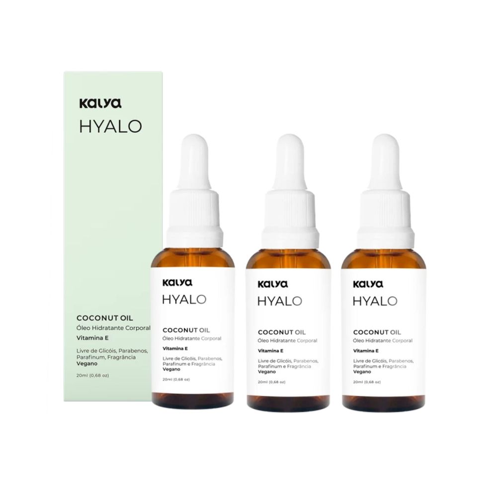 O Óleo de Coco Corporal Kalya Hyalo Coconut foi o primeiro Óleo de Coco Corporal Puro desenvolvido especificamente para Área Externa Íntima da Vulva. Hyalo Coconut Oil é tudo que você pode esperar de um produto diferenciado, sua hidratação favorece, protege e forma uma barreira protetora na área externa da região íntima, auxiliando em casos de secura íntima, pois ajuda a desenvolver sua lubrificação natural. Além disso, o poder do óleo de coco ajuda no combate de infecções no local, como a proliferação de fungos e mantém o PH da região íntima em equilíbrio. Um produto puro, natural, vegano, sem fragrância, sem glicóis, sem parabenos e sem corante. Também possui Vitamina E em sua composição conhecido como um poderoso hidratante e regenerador da pele. PRINCIPAIS BENEFÍCIOS: Protege a região íntimaForma uma camada que ajuda evitar infecções Contribui para o controle de fungos que já estão no localAlto poder hidratante para a região íntimaMantém o PH da região íntima em equilíbrio Principais dúvidas: Porque o Óleo de Coco Puro Corporal Hyalo Coconut Kalya é diferente do Óleo de Coco Comum?Porque o Óleo de Coco para cosmético é exclusivo para esse fim. Ele passa por processos industriais para ficar adequado ao uso cosmético. O Óleo de Coco Corporal Coconut Kalya é seguro para o uso da Região Externa Íntima (Vulva)? Sim, como informado, trata-se de um óleo de coco extremamente puro, sem fragrância, sem glicóis, sem parabenos e sem corante que não oferece risco a saúde. O termo Corporal da embalagem é utilizado para fins de regulamentação da Anvisa, pois trata-se de um produto para pele íntima externa (vulva). Além disso, o fabricante tem autorização de funcionamento, técnico responsável e o produto possui registro nos órgãos regulamentadores (Anvisa). ANVISA: Processo: 25351.223400/2022-56 AFE 2.02.756-2 Observações importantes: Hyalo Coconut Oil é um produto hidratante de uso EXTERNO (Vulva) que favorece a lubrificação natural íntima e NÃO pode ser utilizado como lubrificante no momento da relação e também NÃO pode ser utilizado com preservativo pois pode haver rompimento do mesmo.  O óleo de coco puro tende a ficar duro devido a presença de ácidos que o constituem, sofrendo o processo de solidificação quando exposto a uma temperatura inferior a 25 graus. Para que tornem líquido novamente, pode ser colocado ligeiramente em banho maria ou colocar a quantidade desejada na palma das mãos esfregando até esquentar e derreter o óleo. Hyalo Coconut Kalya é um produto Natural e nunca deve ser substituido por nenhum tratmento médico. Cuidar da saúde íntima é importante! Consulte o ginecologista regularmente. Composição: Cocos Nucifera Fruit Oil, Tocopheryl Acetate. Óleo de Coco, vitamina E Modo de Usar: Aplicar por toda a pele e região dos lábios da região íntima da vulva massageando suavemente. Principais Tags de Pesquisa:óleo de coco benefícios na região íntima, oleo de coco para saude intima, oleo de coco saude intima, oleo de coco intimo, óleo de côco extra vírgem para regiao intima