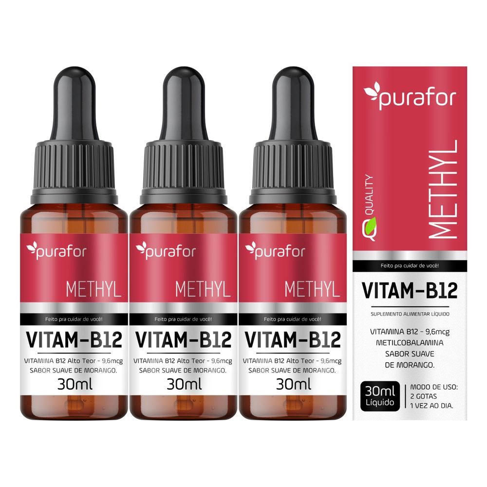 Kit 3 Vitamina B12 Metilcobalamina 30ml Purafor – Sabor Morango, Alta Absorção